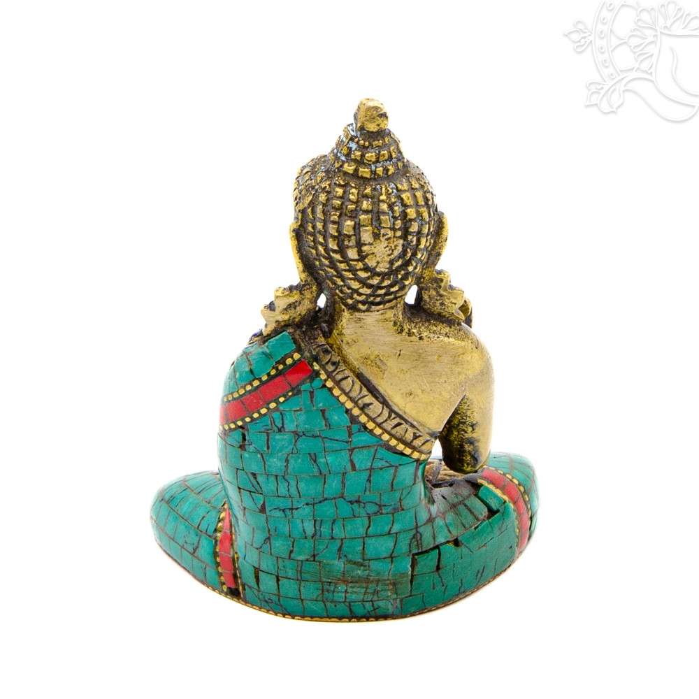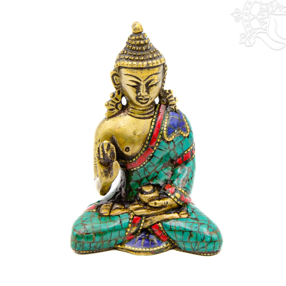 Rézből készült Áldó Buddha szobor, kővel berakott, alj nélkül. A kő berakás különös gonddal készült, a legjobb minőség. Magassága 8 cm. A termék áldott.