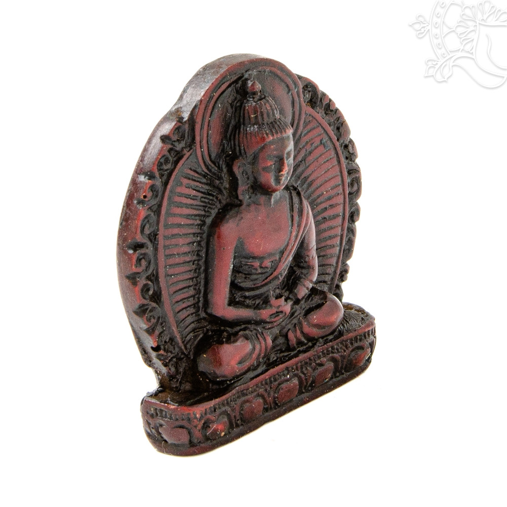 Ez az 5 cm magas és 4 cm széles, vörös színű, lapos Amitabha Buddha szobor rezinből (műgyantából) készült. Amitabha Buddha a végtelen fény és a belső béke megtestesítője, aki meditációs tartásban ül, kezében a tudat elmélyülését kifejező kéztartással. A hátoldali íves sugarak a tiszta tudat ragyogását idézik, míg az alsó motívumok a hagyományos buddhista művészet részleteit hordozzák. Kis méretének köszönhetően könnyen elhelyezhető otthoni oltáron vagy asztalon, finoman emlékeztetve a nyugalom és a harmónia jelenlétére.