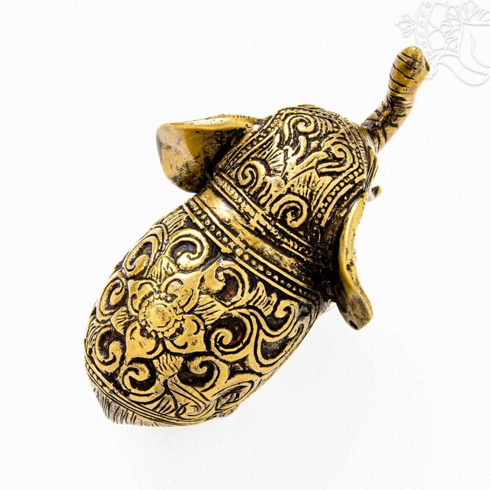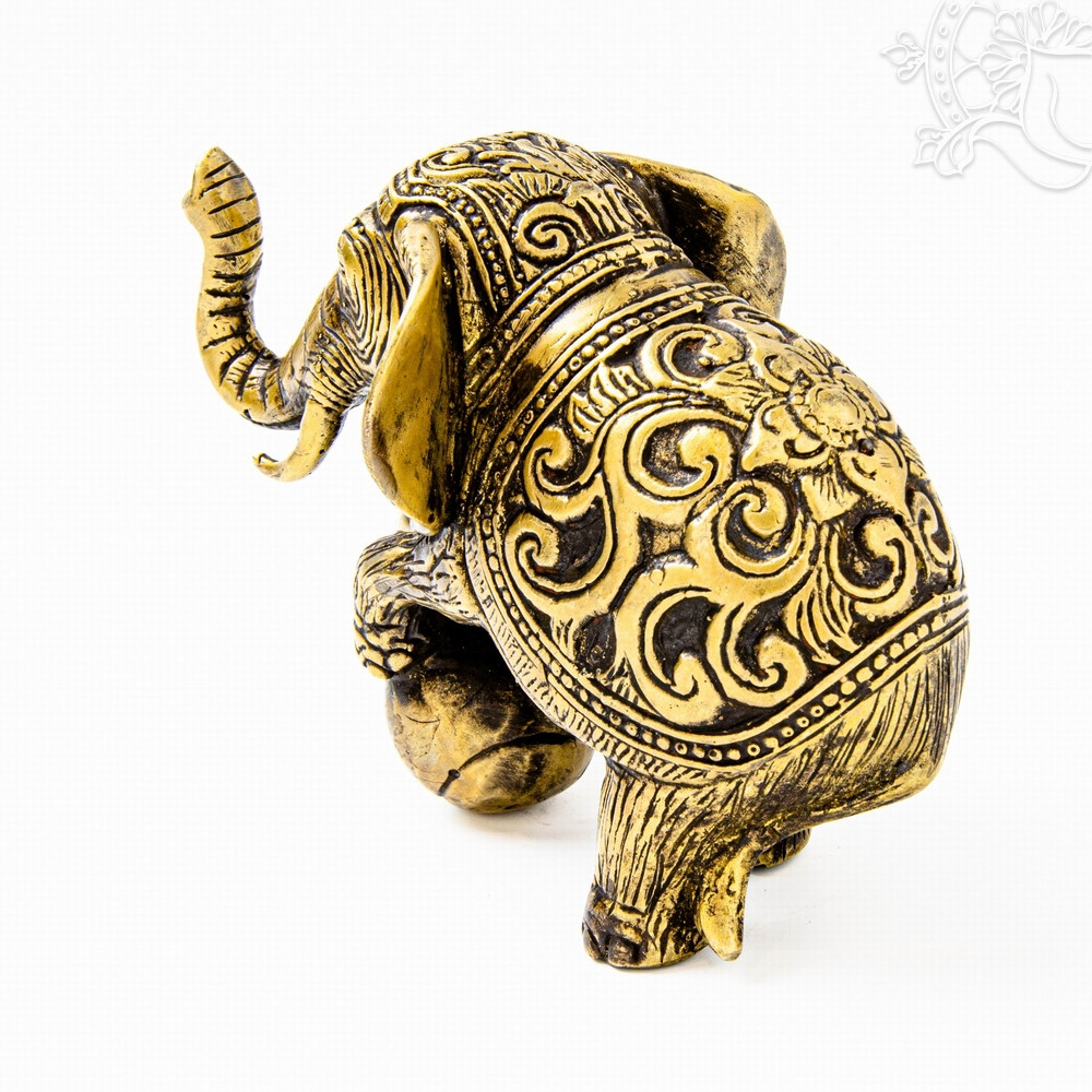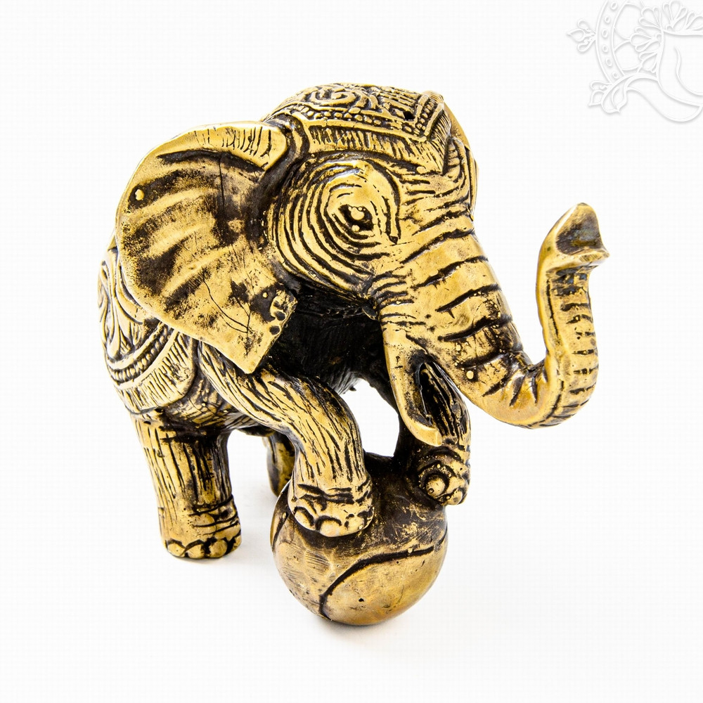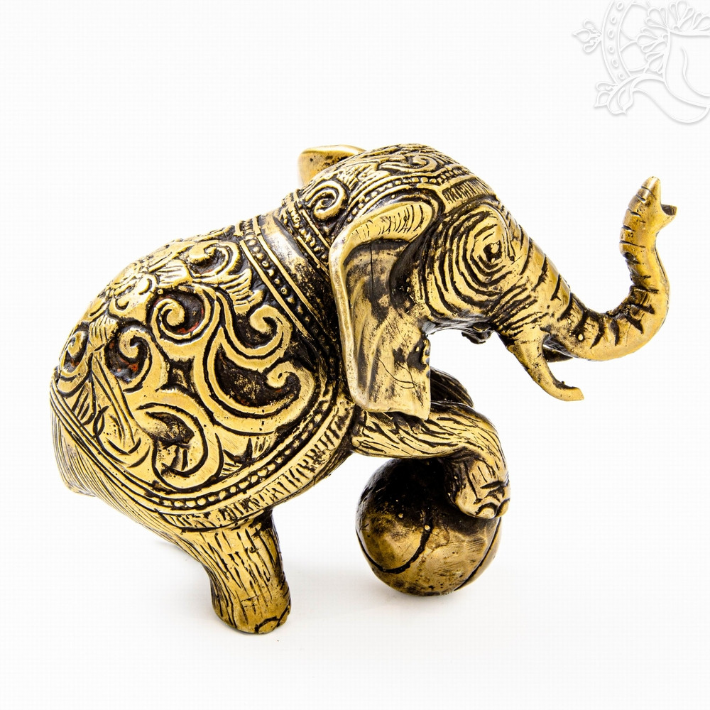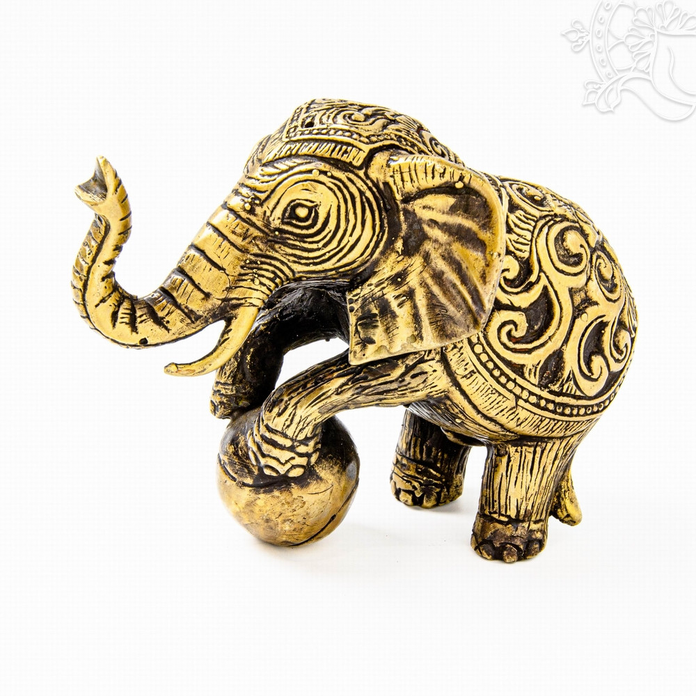 Ez a 12,5 cm hosszú, 9,5 cm magas és mindössze 244 grammos, könnyű, matt sárga réz elefántszobor egy labdával játszó kis elefántot ábrázol, amely már első pillantásra mosolyt csal az arcra. A felemelt ormány, a kerek labda és a finoman díszített test a játékosságot, a kíváncsiságot és a barátságos természetet szimbolizálják. Az elefánt hagyományosan a szerencse, a védelem és a stabilitás jelképe, itt azonban egy könnyed, vidám oldalát mutatja meg, amely pozitív, örömteli hangulatot teremt a környezetben. Könnyű súlya és kedves formája miatt polcra, íróasztalra vagy gyerekszobába is nagyszerű választás, ahol derűt és jókedvet sugároz.