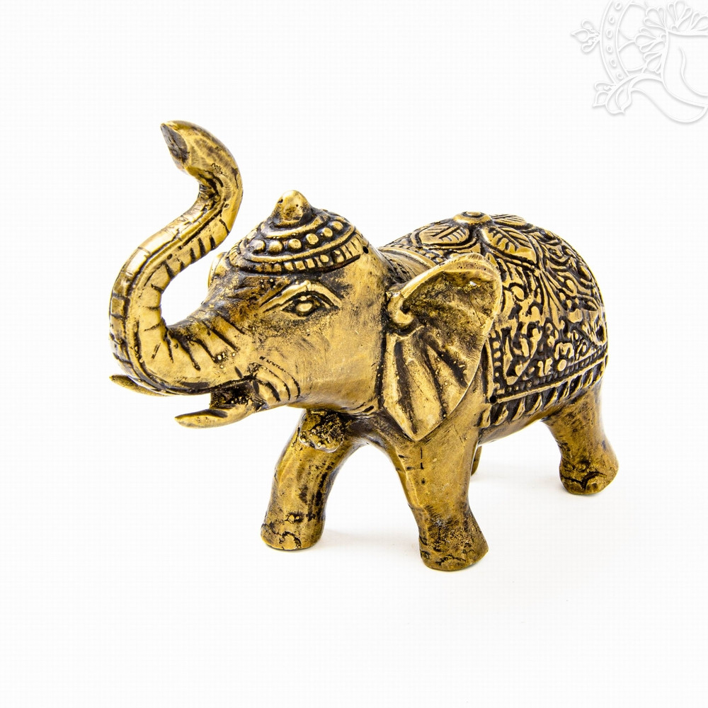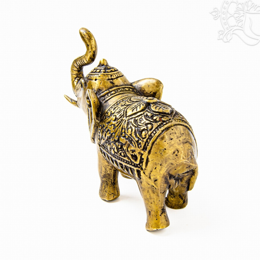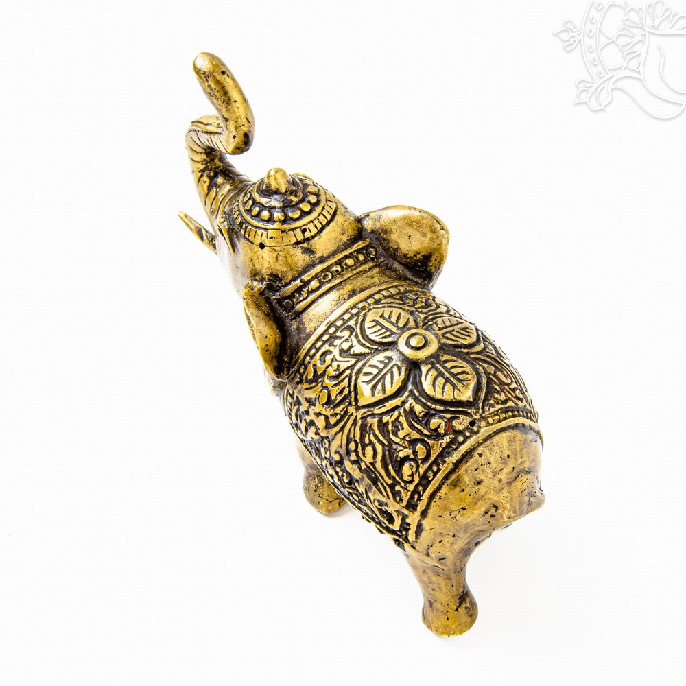 Ez a 13 cm magas és 15 cm hosszú, 280 gramm súlyú matt sárga réz elefánt a bölcsesség, az erő és a szerencse szimbóluma. A díszes takaróval és fejdísszel ellátott elefánt elegáns, hagyományos megjelenést kölcsönöz bármely térnek.