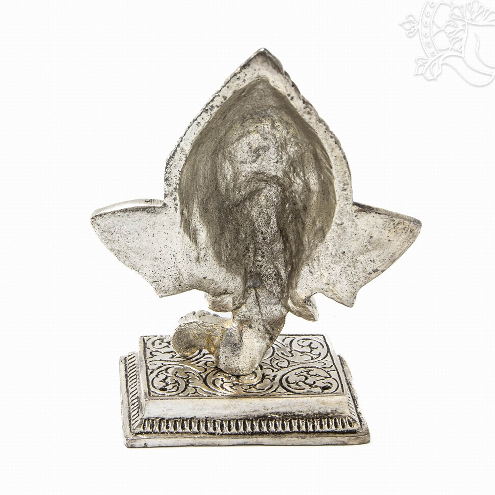 Ez a 12 cm magas, fém ötvözetből készült Ganesha fej szobor finoman mintázott talapzaton áll, amelynek mérete 6,5x4,5 cm. Ganesha, az akadályok elhárítója és a jó szerencse, bölcsesség, bőség hozója, az egyik legkedveltebb hindu istenség, így alakja különösen kedvelt otthoni és munkahelyi környezetben is. A szobor részletgazdag arcvonásai és a tradicionális fejdísz a nepáli-indiái kézműves hagyományokra jellemző stílusban jelennek meg. Kisméretű, mégis karakteres darab, amely kedvelt szimbólumként társul a mindennapi élethez.