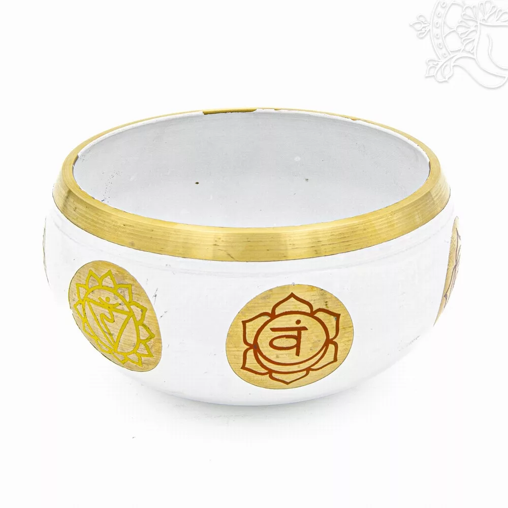 Géppel készített 7 fémes, fehér színű, 7 csakra mintás hangtál - 12 cm