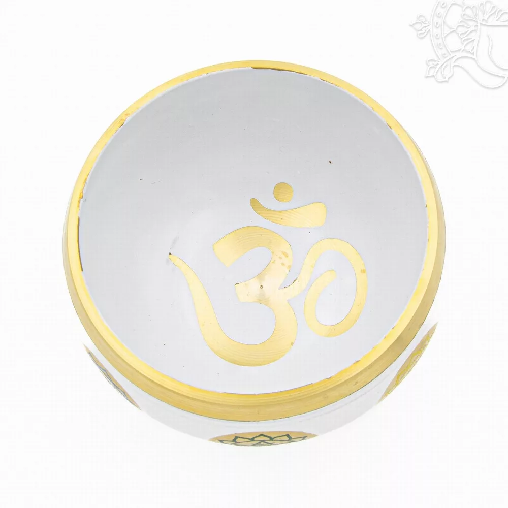 12 cm átmérőjű, 8 cm magas, 660 gramm súlyú géppel készített 7 fémes, fehér színű hangtál, oldalán arany színű 7 csakra szimbólummal, belül OM jellel díszített.