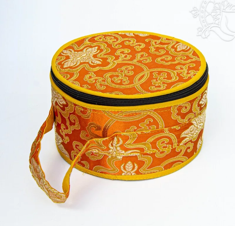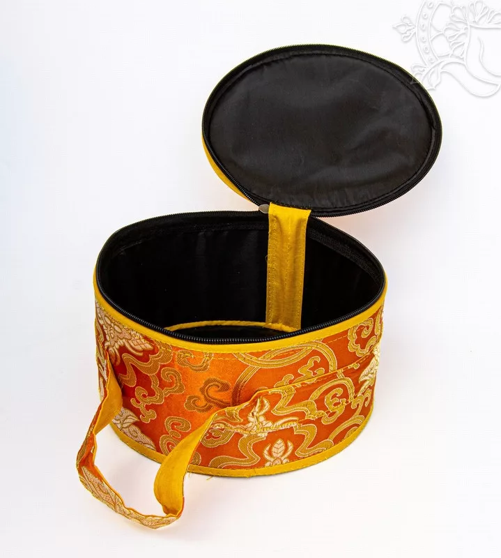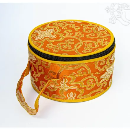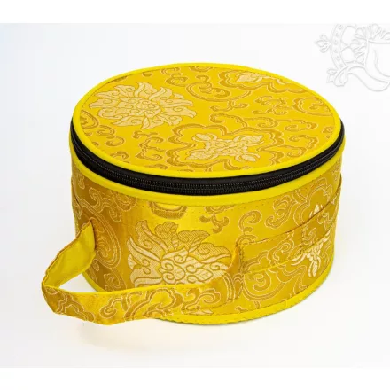 Hangtál tartó brokátból, többféle színben. 20 cm átmérőjű, 10 cm magas. Védi a hangtálakat és egyszerűsíti a szállítást. A termék áldott.