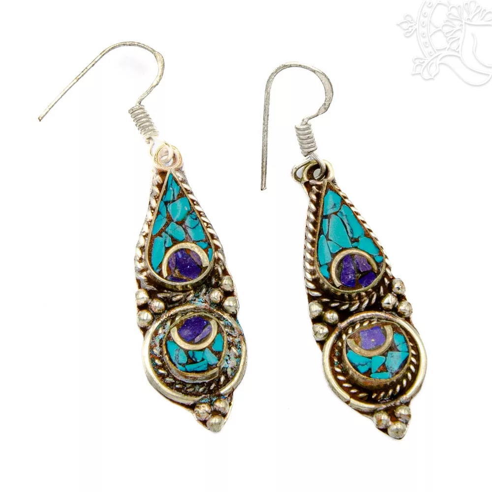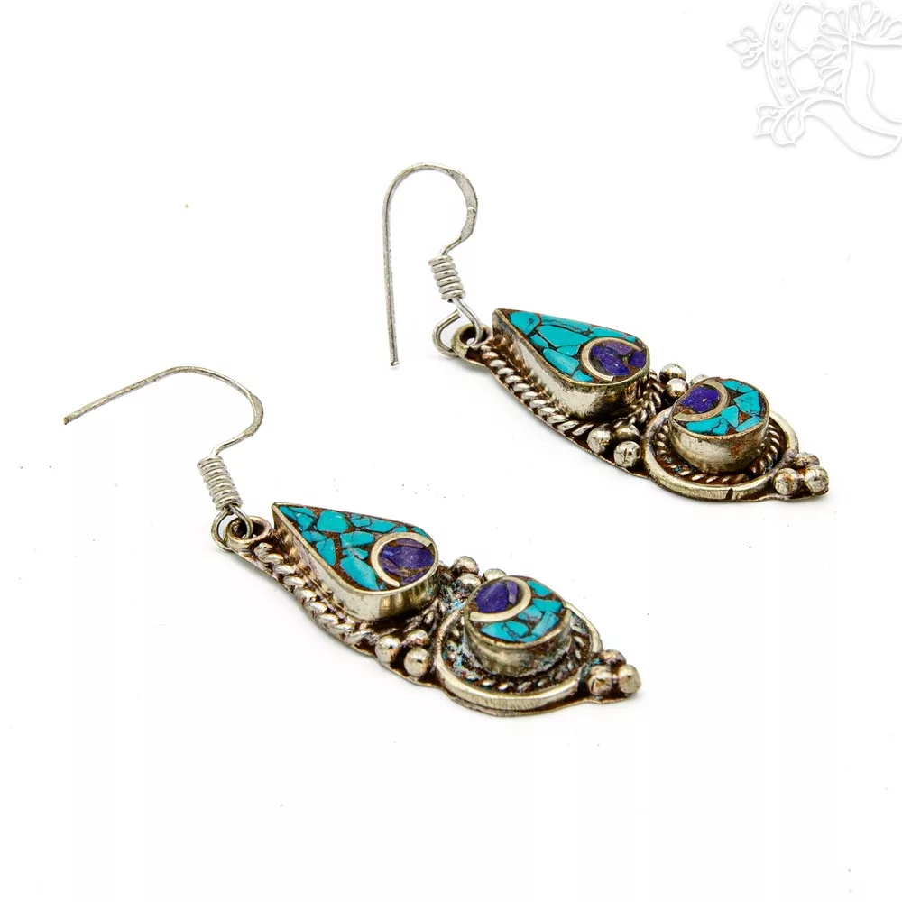 Kézműves tibeti fülbevaló, amelyet csepp alakú türkiz és félkör alakú lápisz szín díszít. A türkiz a békét és a harmóniát, a lápisz a bölcsességet és a belső látást szimbolizálja.