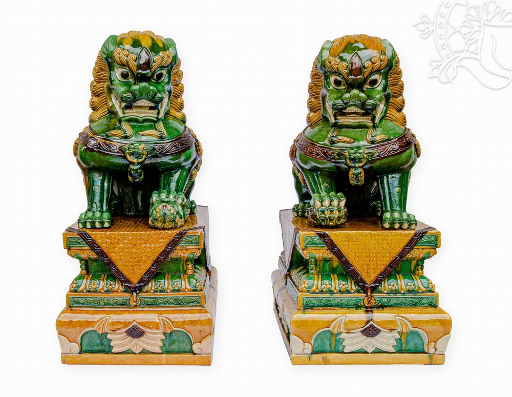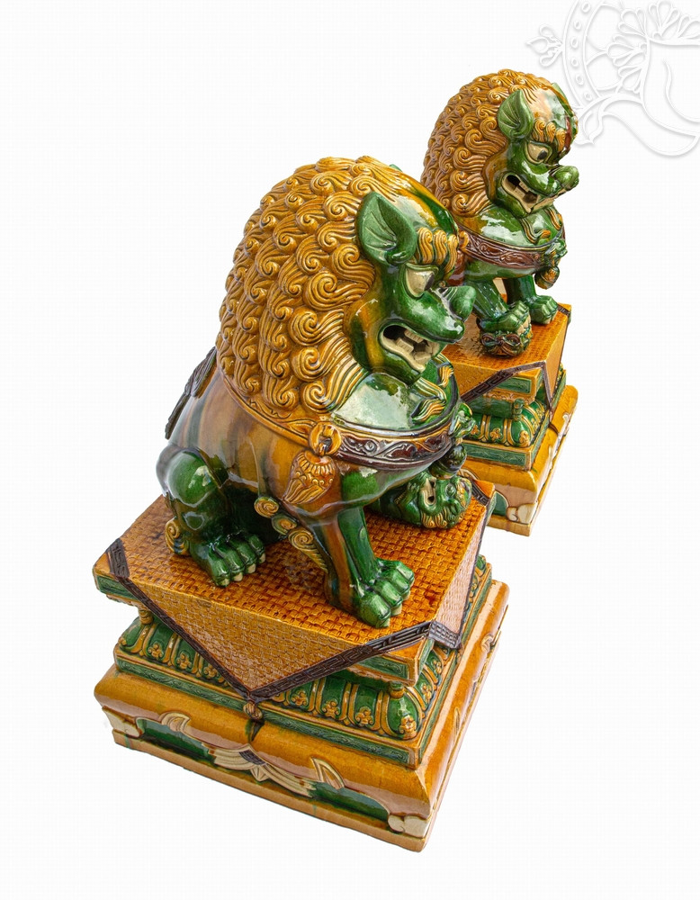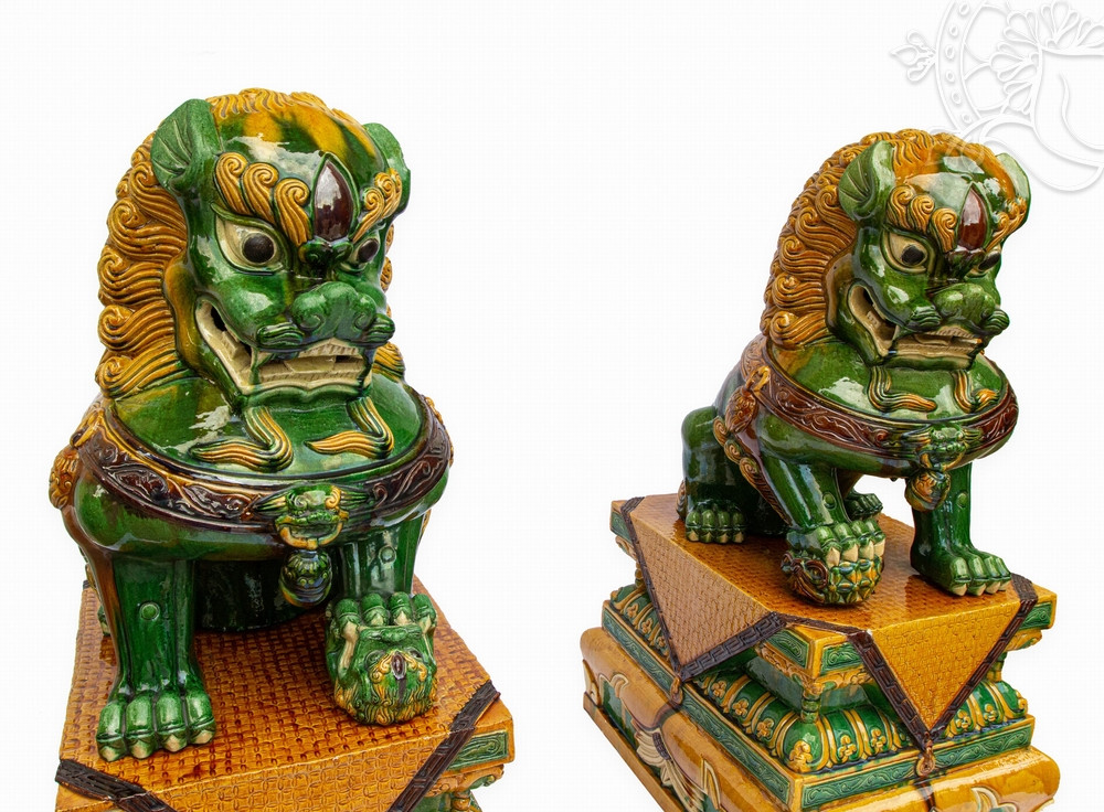 Az impozáns méretű szobrok aljzata 46,5 x 56,5 cm, maguk az oroszlánalakok pedig 61 cm magasak, így együtt 102 cm magas, tekintélyt sugárzó alkotást alkotnak. A mázas kerámia anyag nemcsak eleganciát, hanem tartósságot is biztosít, míg a gazdag zöld, sárga és barna árnyalatok a hagyományos kínai művészet színvilágát idézik.
