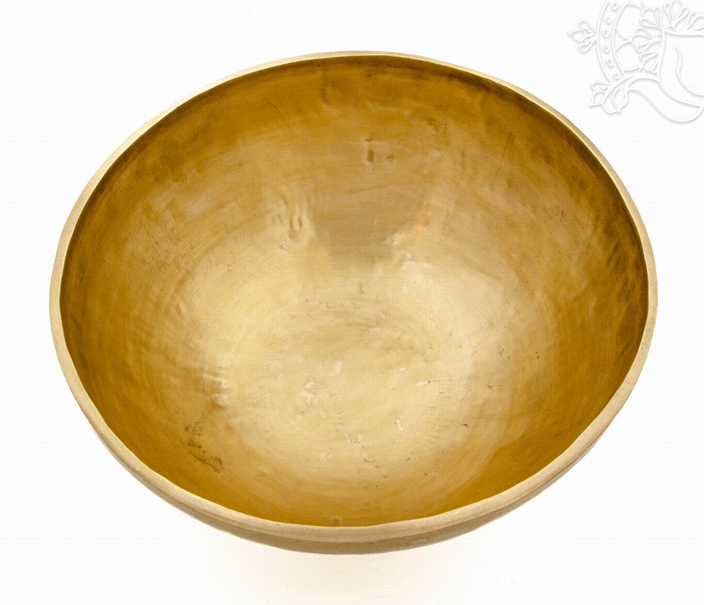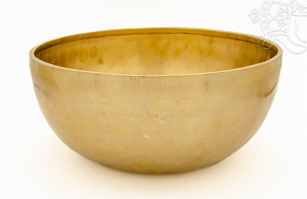 Kézzel kalapált, 7 fémes 2982 grammos sárga hangtál elsősorban az alsó kettő csakra harmonizálására.
