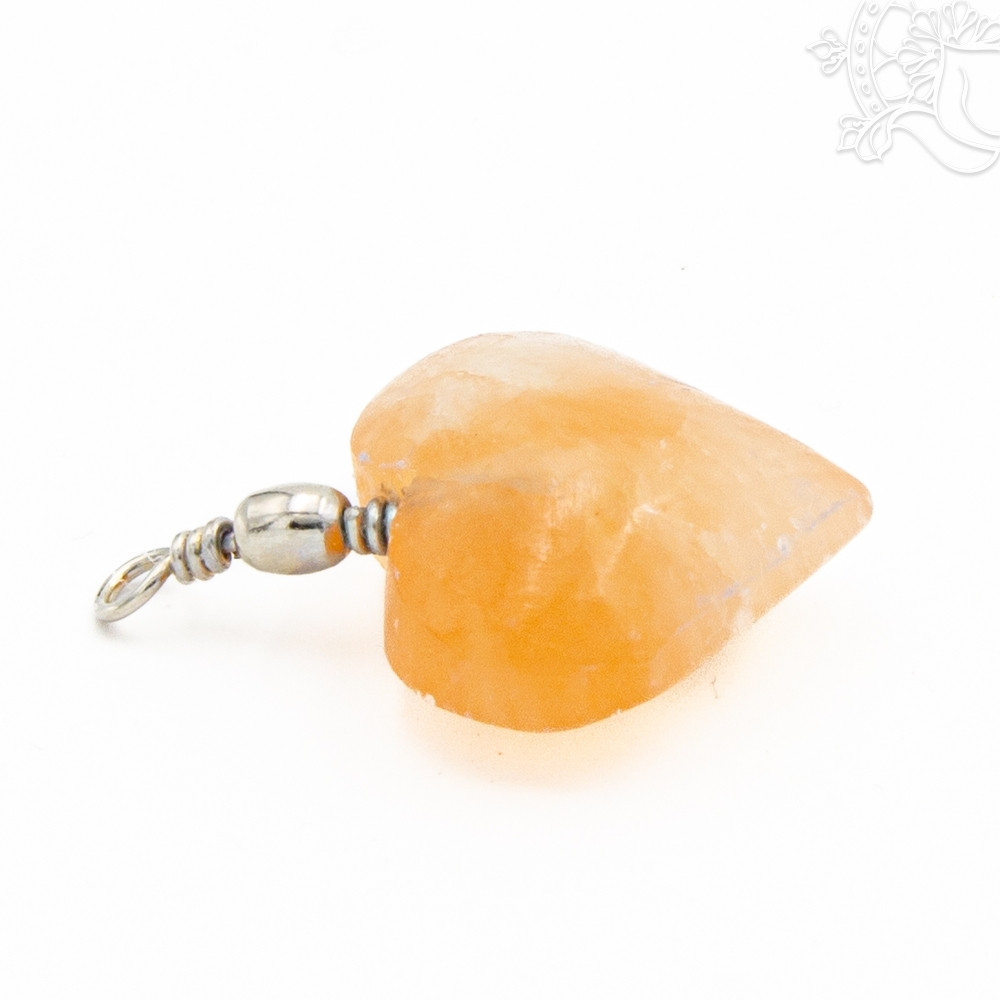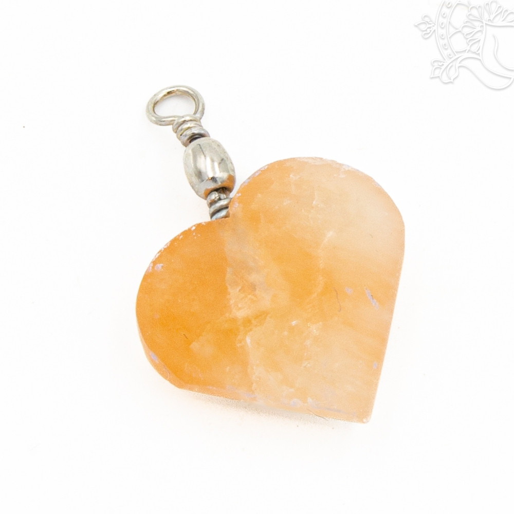 Szív alakú, narancssárga szelenit kristály medál fém akasztóval. A medál 2 cm széles, teljes hossza az akasztóval együtt 3,5 cm, így könnyen hordható nyakláncon vagy zsinóron. A szelenit a tisztaság, a béke és az energetikai harmónia köve, amelyet gyakran használnak meditációhoz és energetikai tisztításhoz. A szív forma a szeretetet, az együttérzést és a belső egyensúlyt jelképezi, így a szelenit és a szív alak együtt különleges spirituális jelentést hordoz.