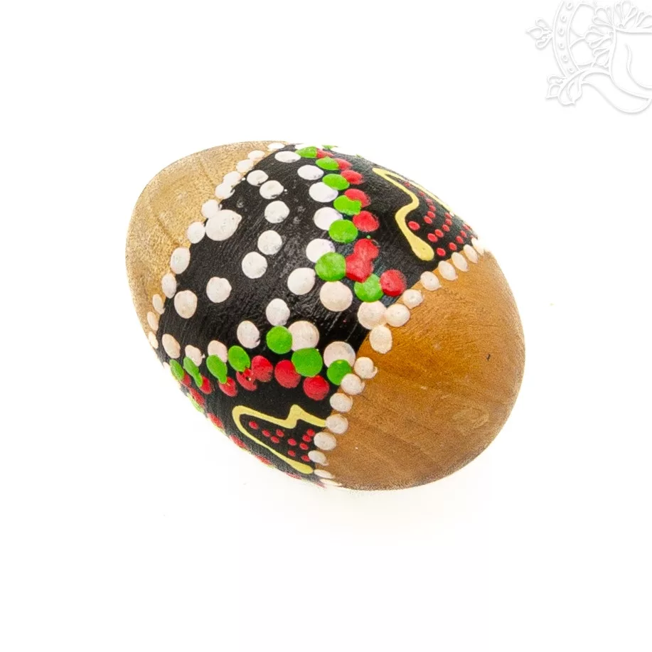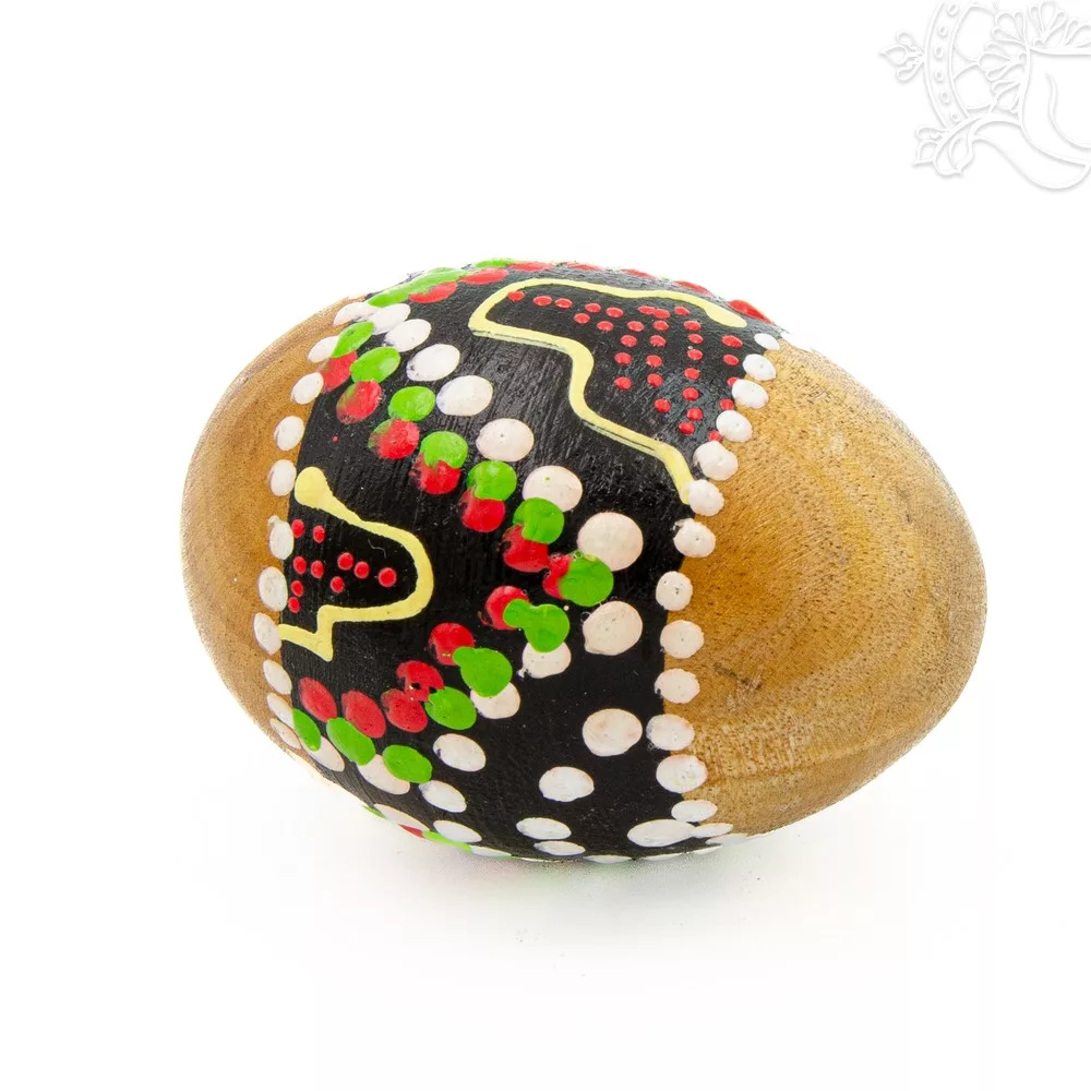6,5 cm magas, tojás formájú, fából készült csörgő, kézzel festett, színes pont- és vonalmintákkal.