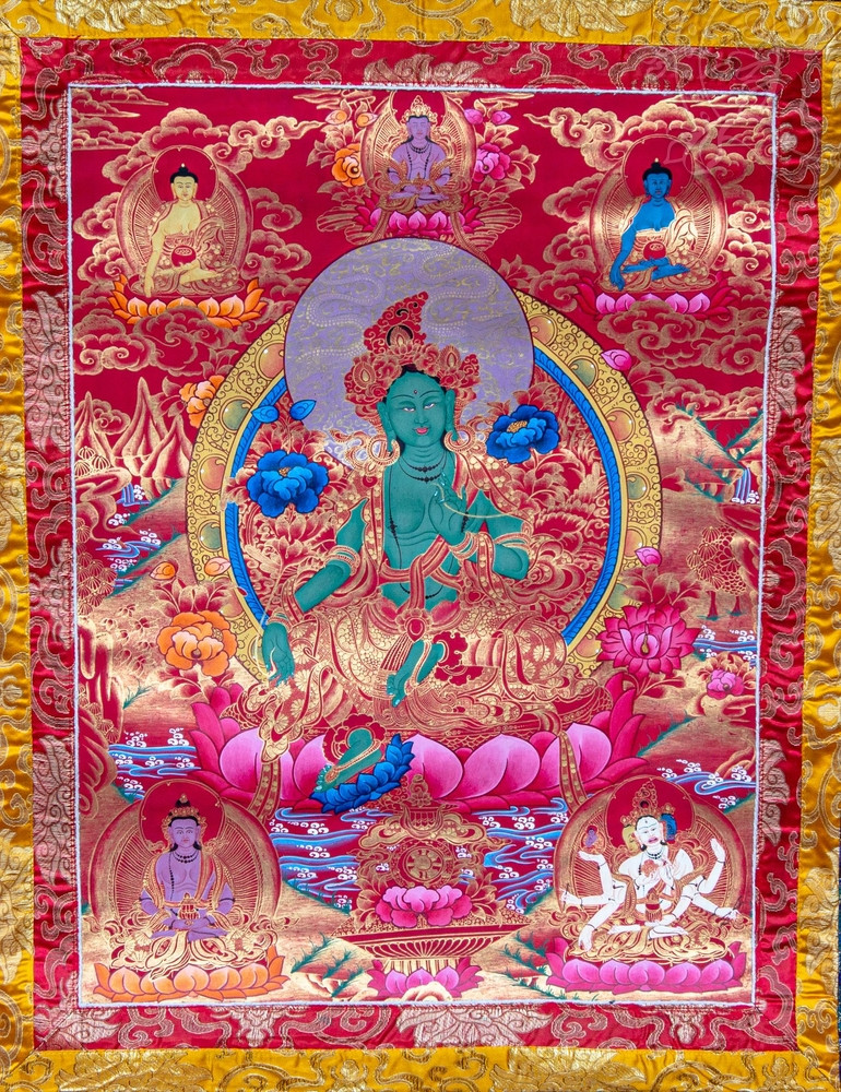 Ez a lenyűgöző, aranyozott thangka Zöld Tárát, a könyörületesség és védelmező női energia megtestesítőjét ábrázolja. A mesteri festményen Tára lótusztrónon ül, jobb keze adományozó, bal keze védelmező tartásban jelenik meg, körülötte további Buddhák és bódhiszattvák jelennek meg arany felhők között. A háttér gazdag vörös-arany tónusa a nepáli Paubha hagyományra jellemző stílust idézi, melyet aprólékos részletfestés és arany pigmentek alkalmazása tesz különlegessé. A selyem brokát keret szimbolikus színeivel (arany, vörös, kék, lila) méltó keretet ad az istennő áldását hordozó képnek.