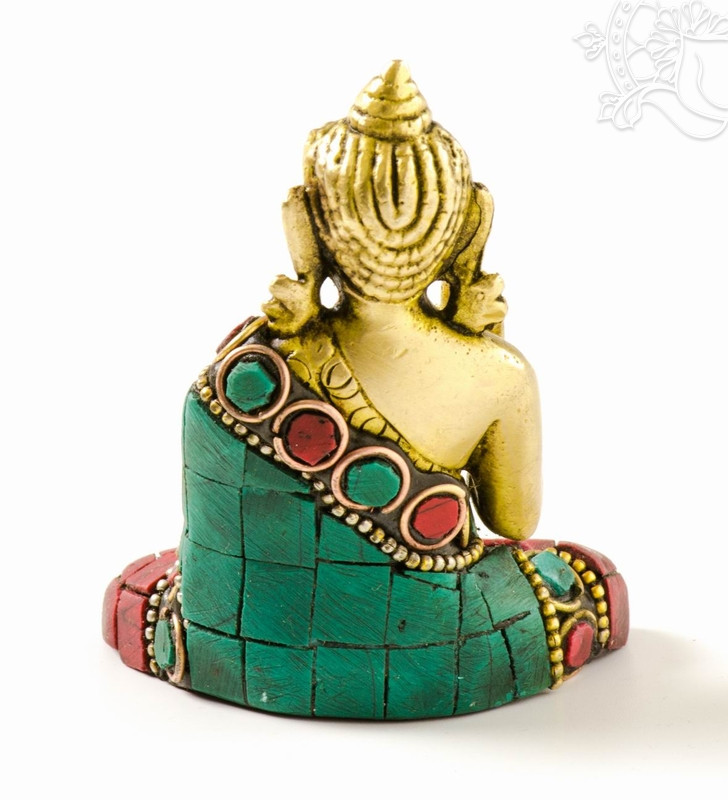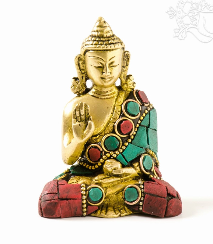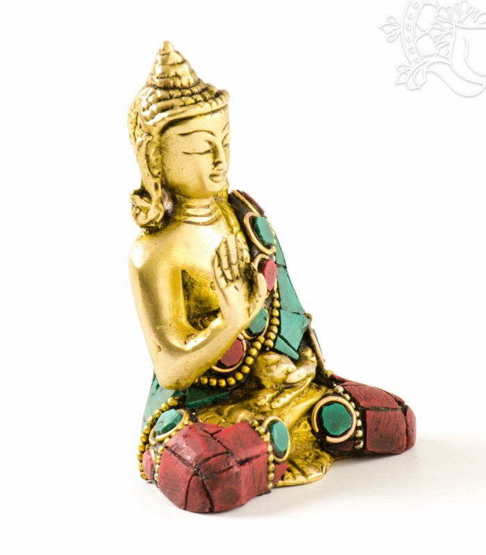 Rézből készült Áldó Buddha szobor, kővel berakott. A szobrok kövezése egyedileg történik, az eges szobrok között a kövezésben kisebb különbségek lehetségesek. Magassága 8 cm, súlya kb. 250 g. A Buddha szobrok jelentéseiről lásd: