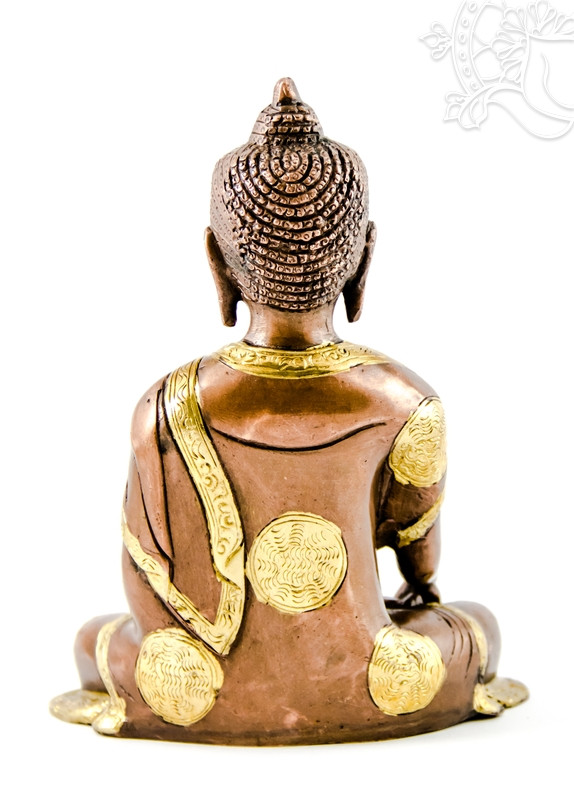 Rézből készült Áldó Buddha szobor, alj nélkül, arany és bronz színű. Magassága 20 cm, súlya 2 kg.A Buddha szobrok jelentéseiről lásd: