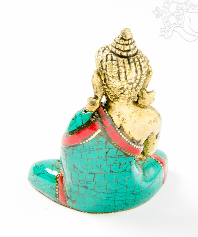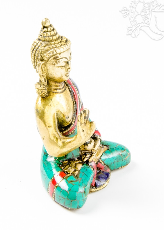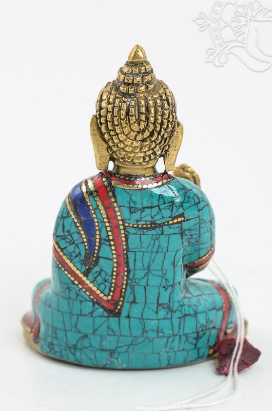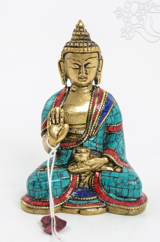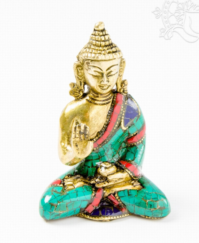 Rézből készült Áldó Buddha szobor, kővel berakott, alj nélkül. A kő berakás különös gonddal készült, a legjobb minőség. Magassága 8 cm. A termék áldott.