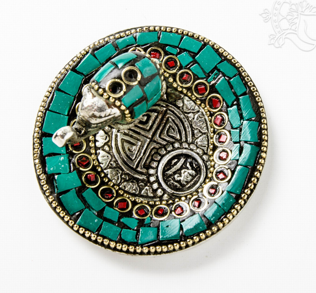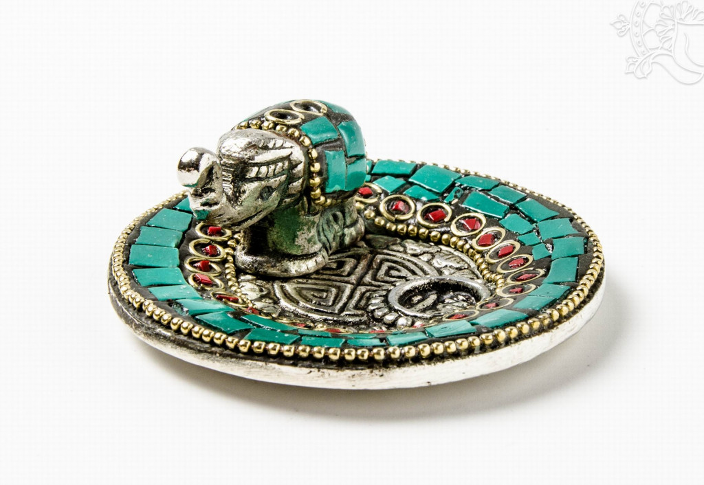 Alumínium füstölő égető, elefánt dísszel, türkiz színű kő berakással. Magassága 2 cm, átmérője 7 cm.