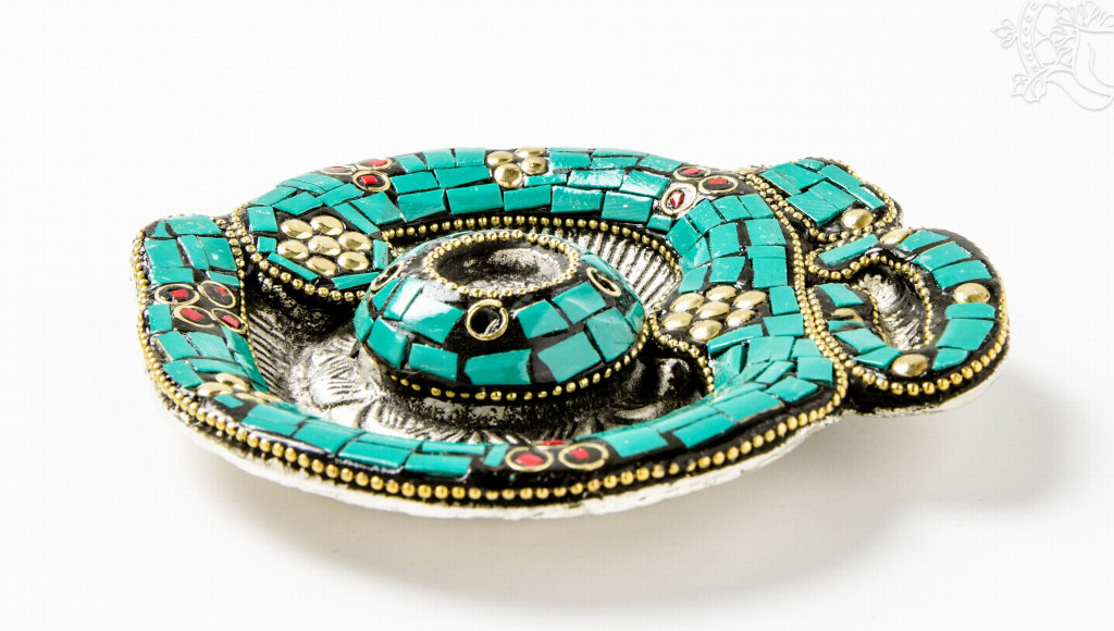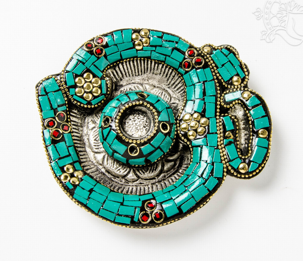 Alumínium füstölő égető, türkiz színű kő berakásos Om-mal. Mérete 11 x 12 cm.OM: