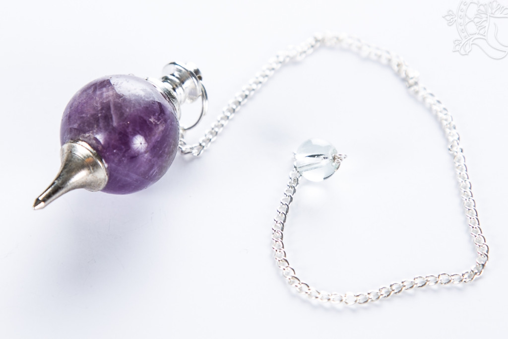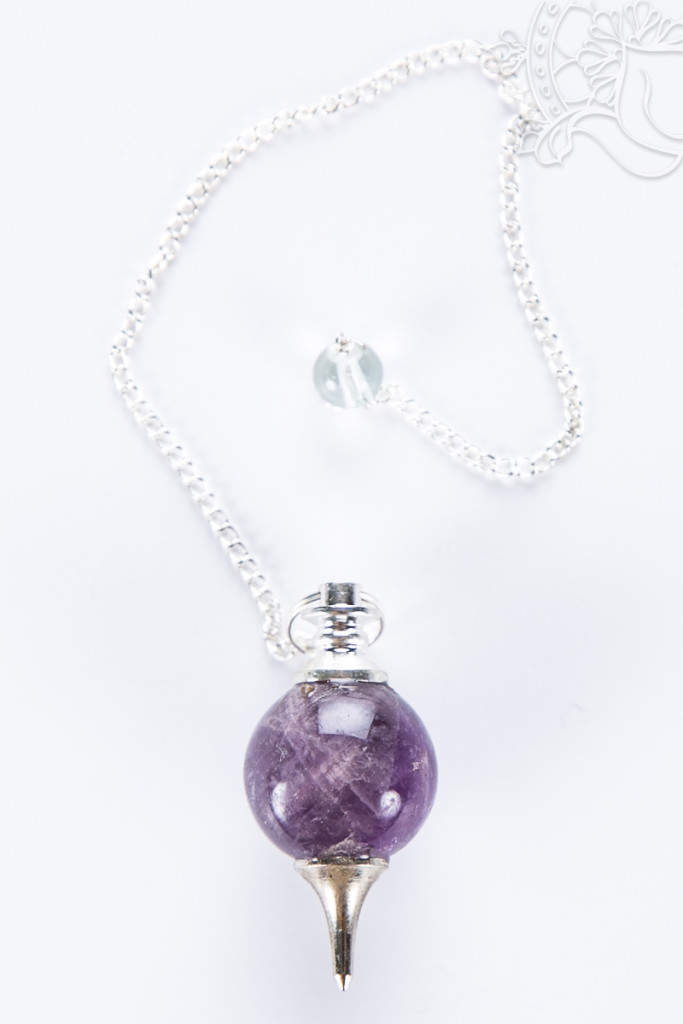 Ametiszt gömb inga. A gömb átmérője 2 cm. A fém részek vörösrézből készültek, ezüsttel bevontak.