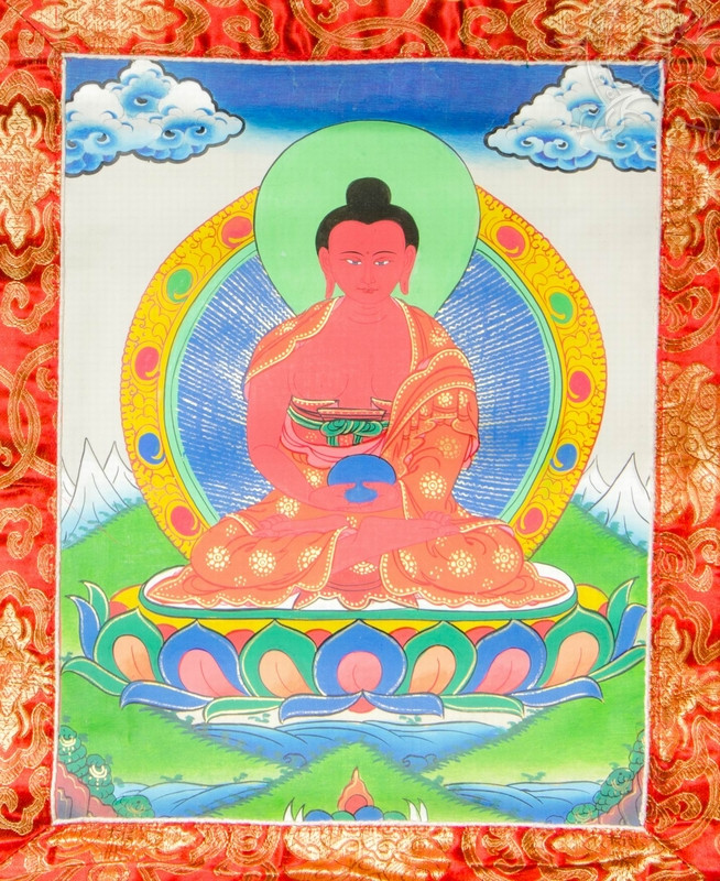 Kézzel festett, eredeti Amitabha Buddha thanka. A kép mérete (brokát nélkül): 35 x 27 cm. A termék áldott.