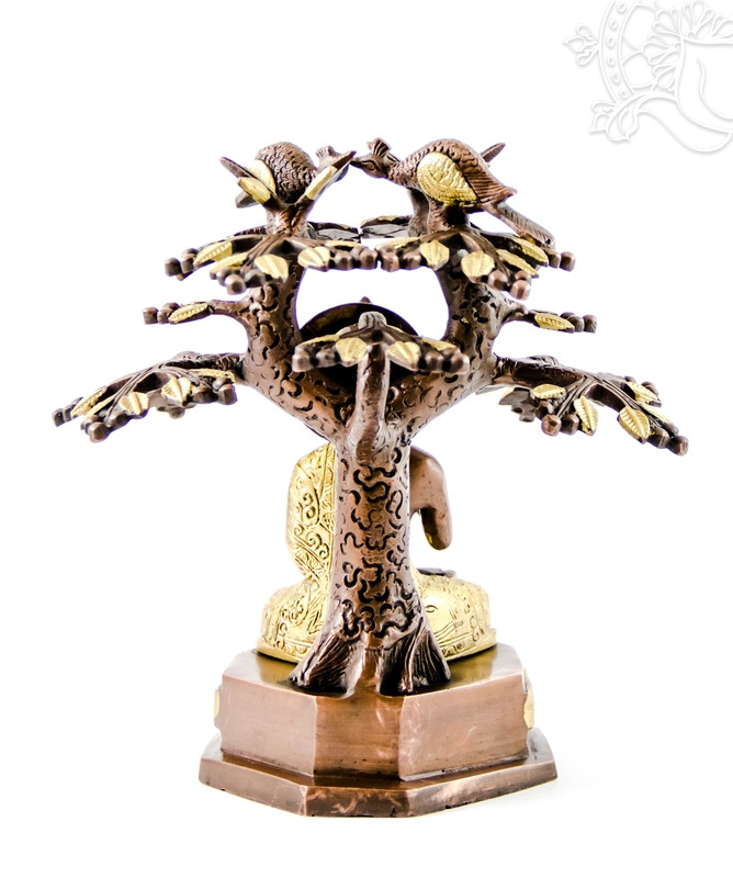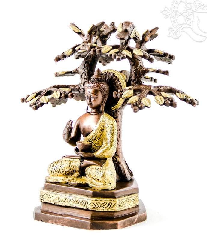 Rézből készült Buddha a bódhi fa alatt szobor, arany-bronz színű. Magassága 24 cm, súlya 3,2 kg.