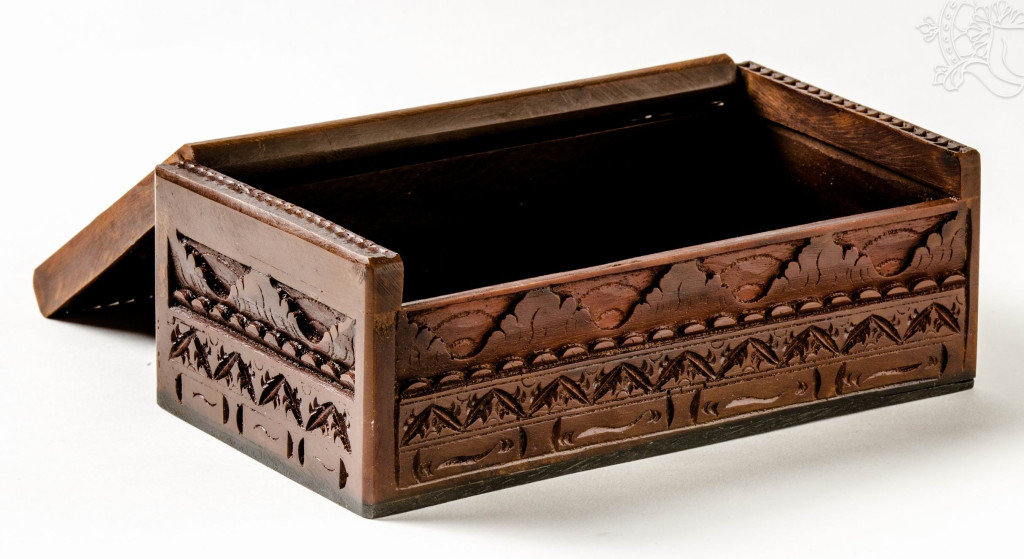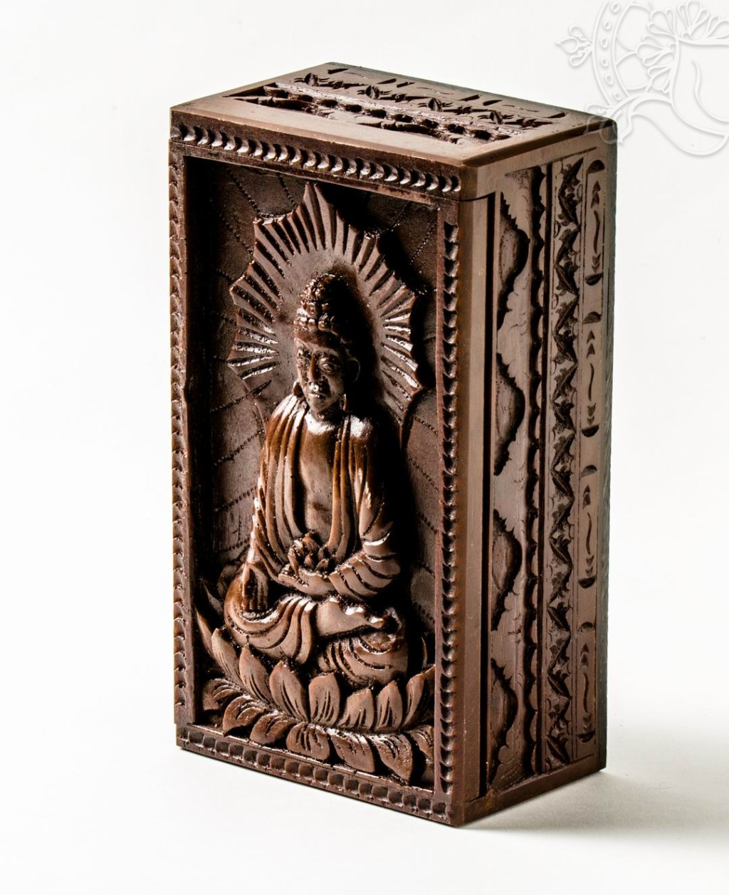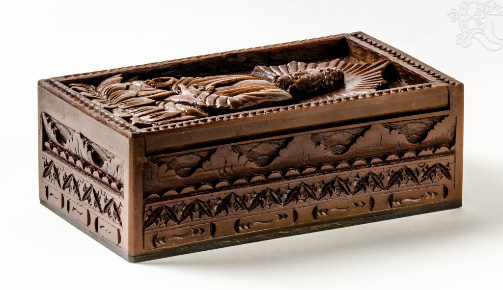A doboz oldala sonokeling (indiai rózsafa) fából készült, kézzel faragott, míg a teteje fiberglass (kemény műgyanta). A doboz hosszúsága 18,5 cm, magassága 6,5 cm és a szélessége 10 cm.