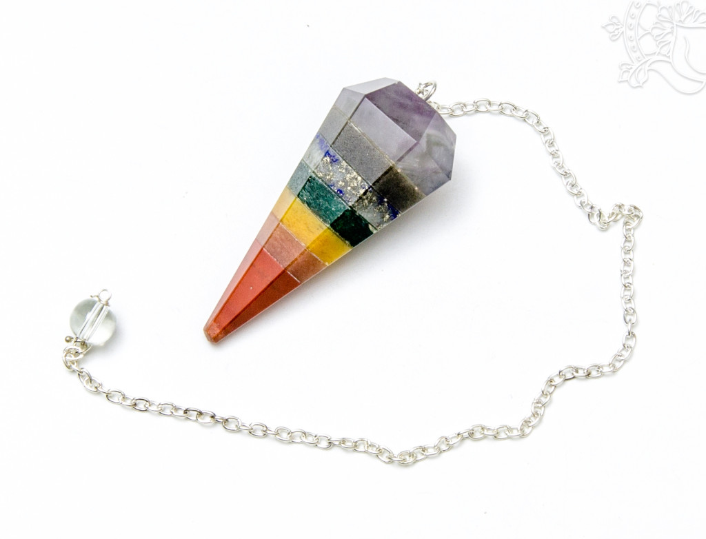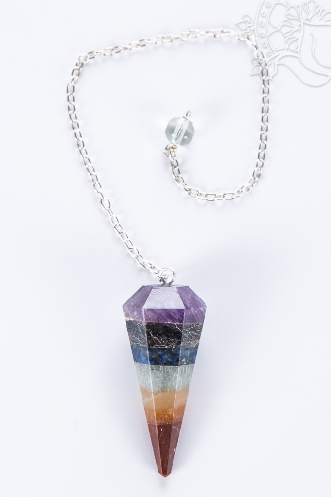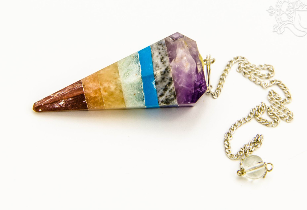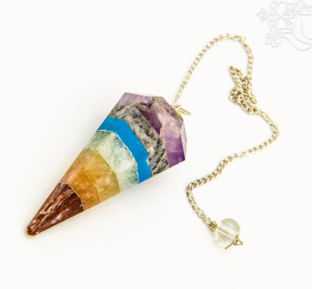 Csakra köves gúla kristály inga. A gúla magassága 4,5 cm. A fém részek vörösrézből készültek, ezüsttel bevontak.