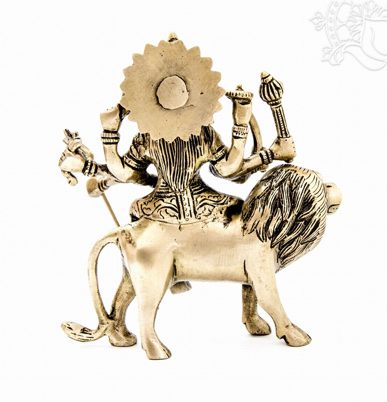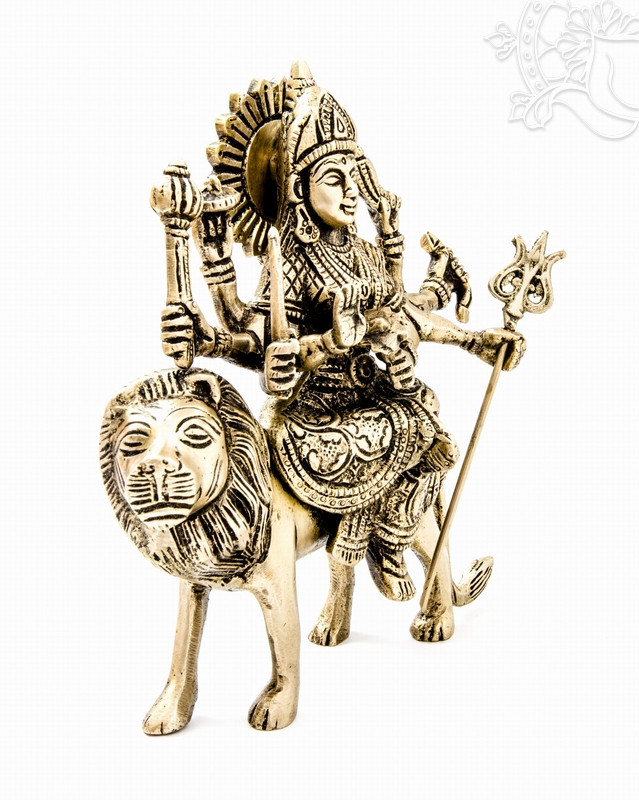 Rézből készült Durga istennő szobor, matt sárga színű. Magassága: 18 cm.Durga az univerzum istennője, Shiva feleségének, Párvati istennőnek egyik formája.