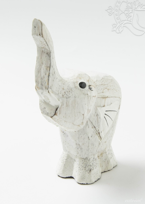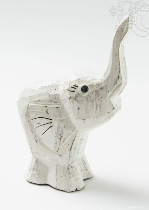 Fából faragott emelt ormányú elefánt szobor. A szobor magassága 15 cm. Az elefánt a siker, az erő, a bölcsesség, a függetlenség, a hatalom, a termékenység, a jámborság, a higgadtság és a hosszú élet szimbóluma.