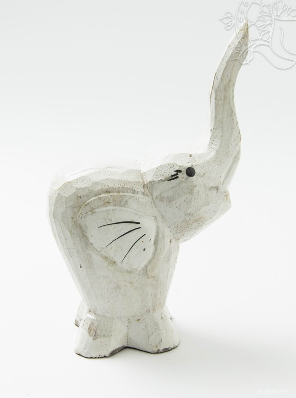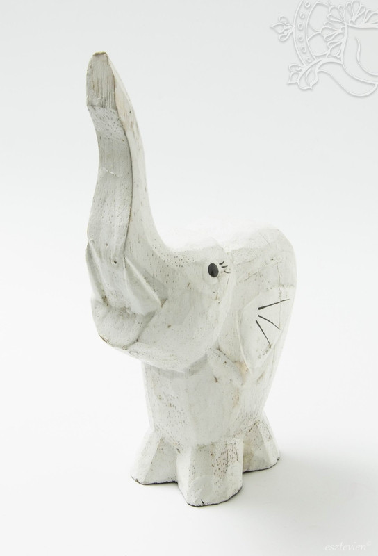 Fából faragott emelt ormányú elefánt szobor. A szobor magassága 19 cm. Az elefánt a siker, az erő, a bölcsesség, a függetlenség, a hatalom, a termékenység, a jámborság, a higgadtság és a hosszú élet szimbóluma.