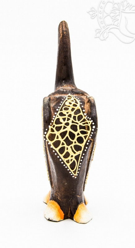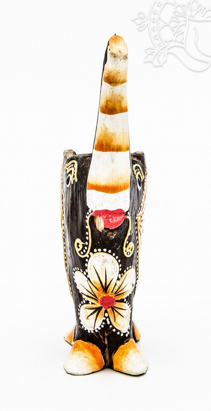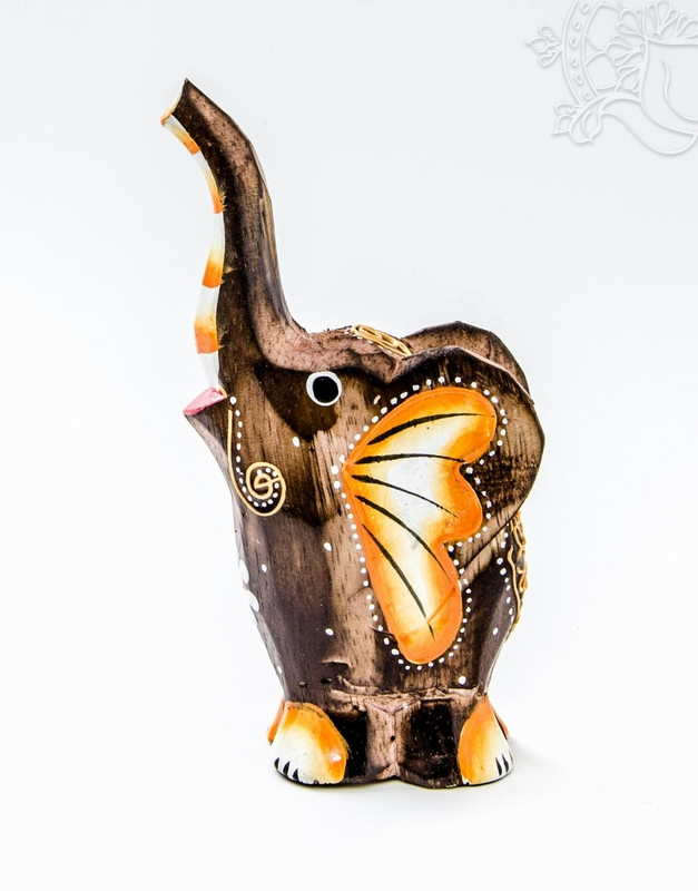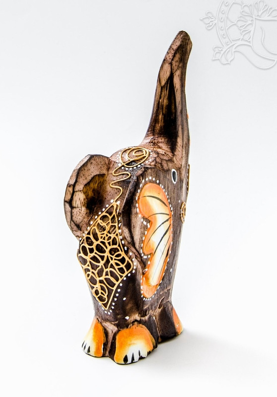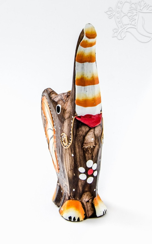 Fából faragott emelt ormányú elefánt szobor. A szobor magassága 14 cm. Az elefánt a siker, az erő, a bölcsesség, a függetlenség, a hatalom, a termékenység, a jámborság, a higgadtság és a hosszú élet szimbóluma.