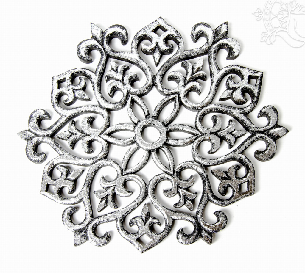 Fából készült kerek fali függő, mandalás, festett ezüst színű. Átmérője 30 cm.