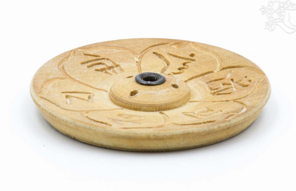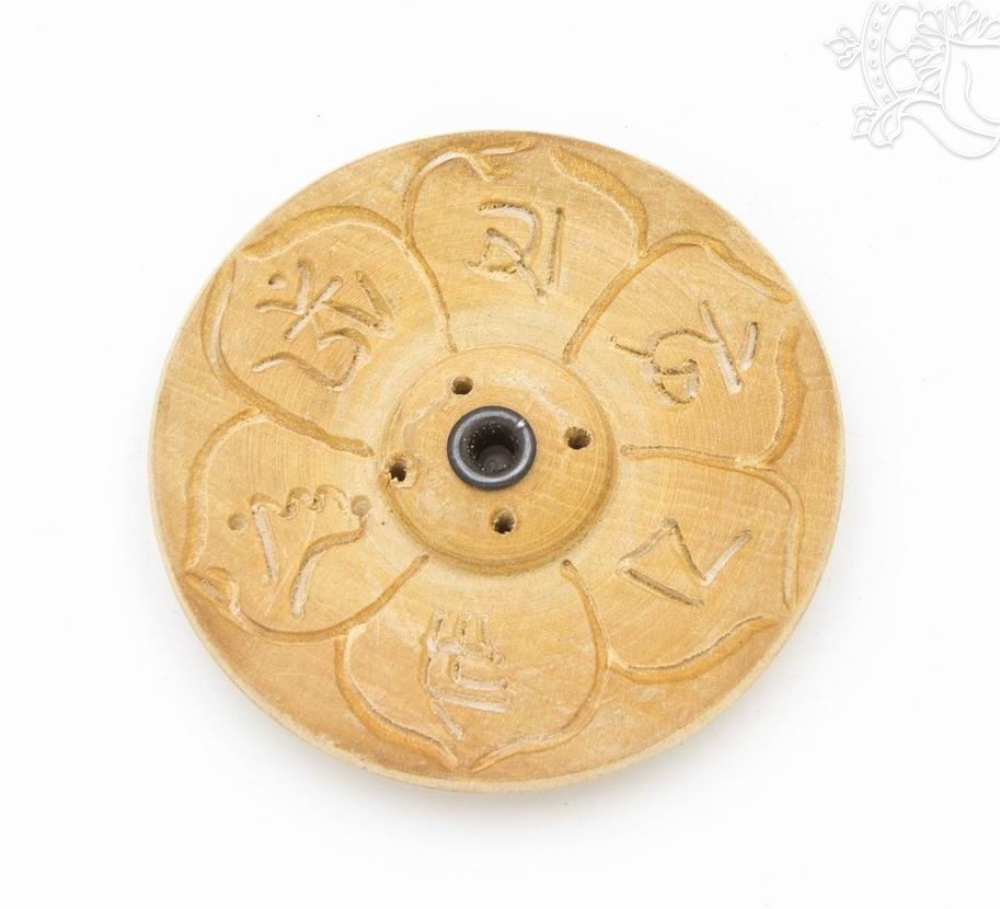 Fából készült füstölő égető Om Mani Padme Hum mantrával. Világos színű.Az égető átmérője: 7 cm. A termék áldott.