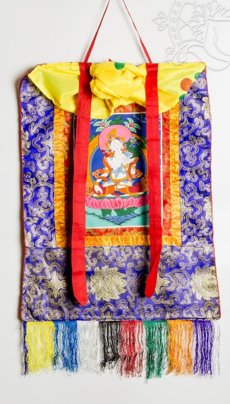 Kézzel festett, eredeti Fehér Tara thanka. A kép mérete (brokát nélkül): 21 x 26 cm. A termék áldott.
