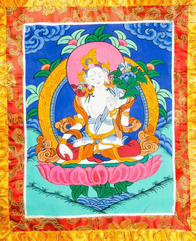 Kézzel festett, eredeti Fehér Tara thanka. A kép mérete (brokát nélkül): 21 ...