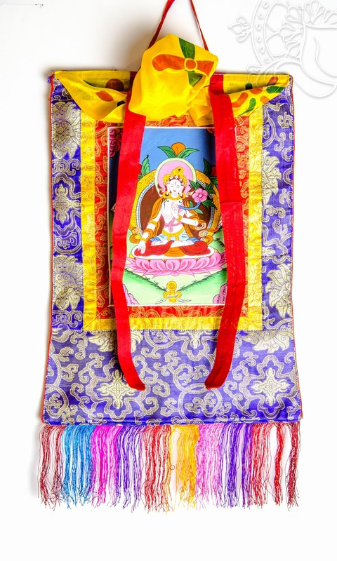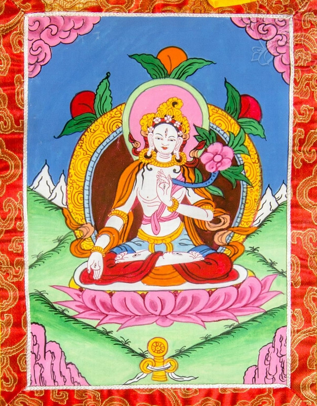 Kézzel festett, eredeti Fehér Tara thanka. A kép mérete (brokát nélkül): 21 ...