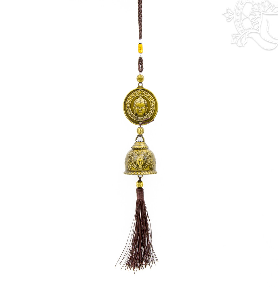 Fémből készült, lógó, középen kétoldalú Shakyamuni Buddha díszítéssel, alul Buddhás csengővel. A dísz átmérője 5 cm, a csengő magassága 6 cm, teljes hossza kb. 42 cm.Buddha Shakyamuni: