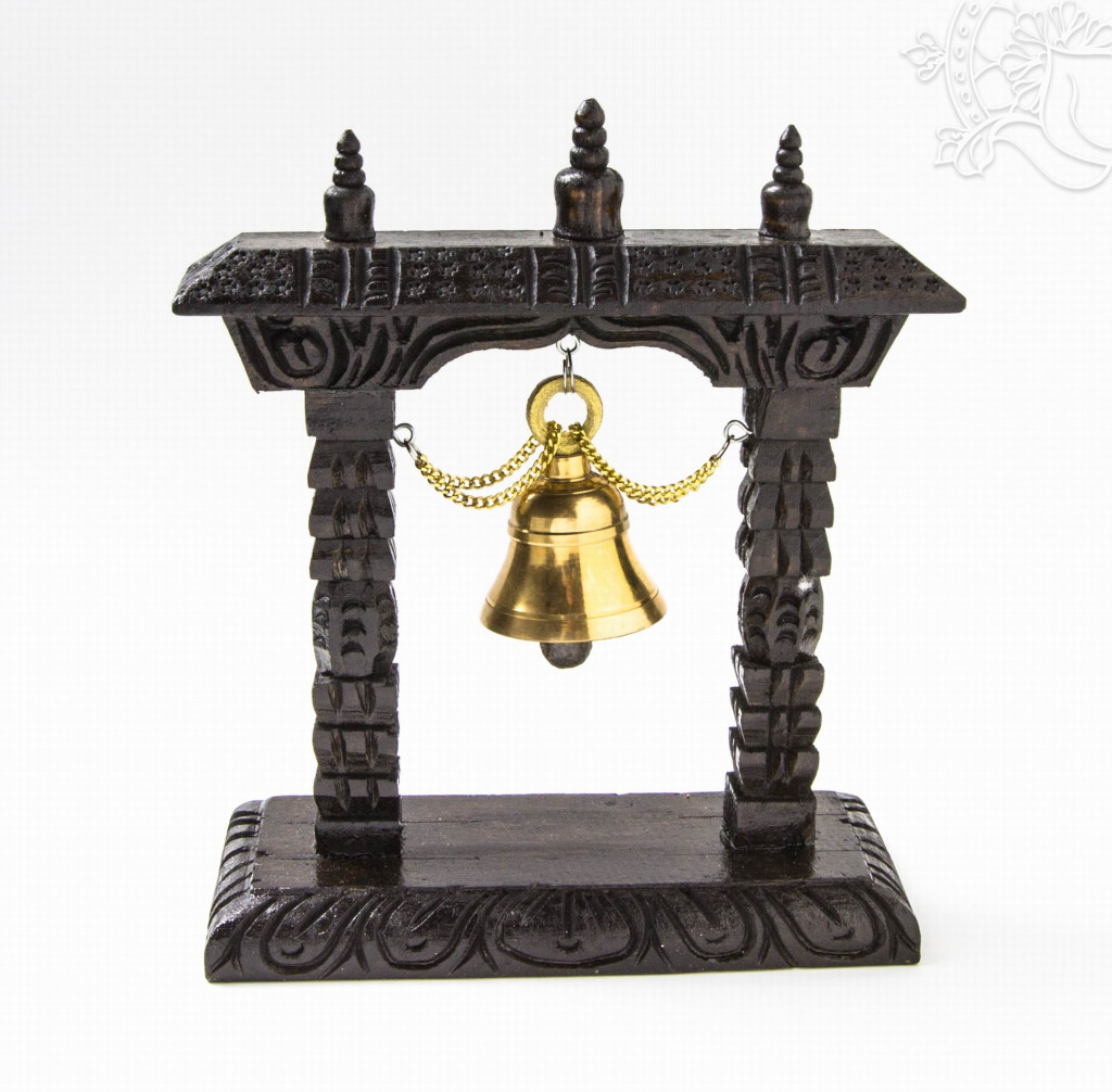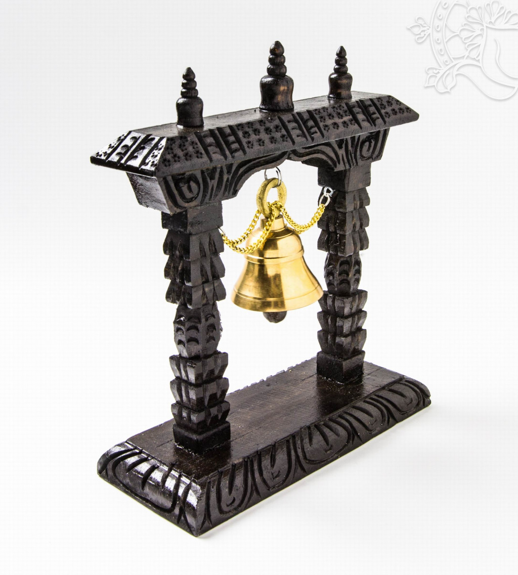 Fém csengő, fekete fa állványon. A csengő magassága 6 cm, a teljes magassága 22 cm. A termék áldott.
