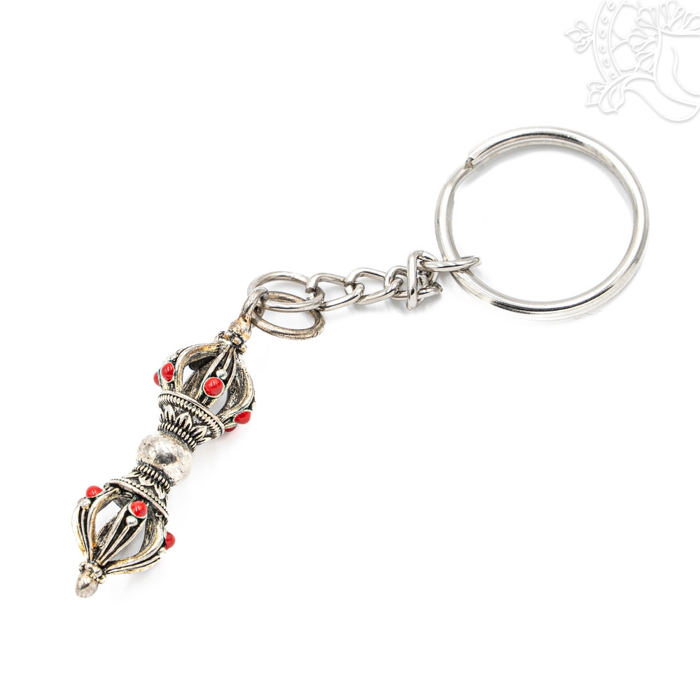 Fémből készült, ezüst színű, dorje kulcstartó, szines díszkövekkel. A dísz magassága 4,5 cm.