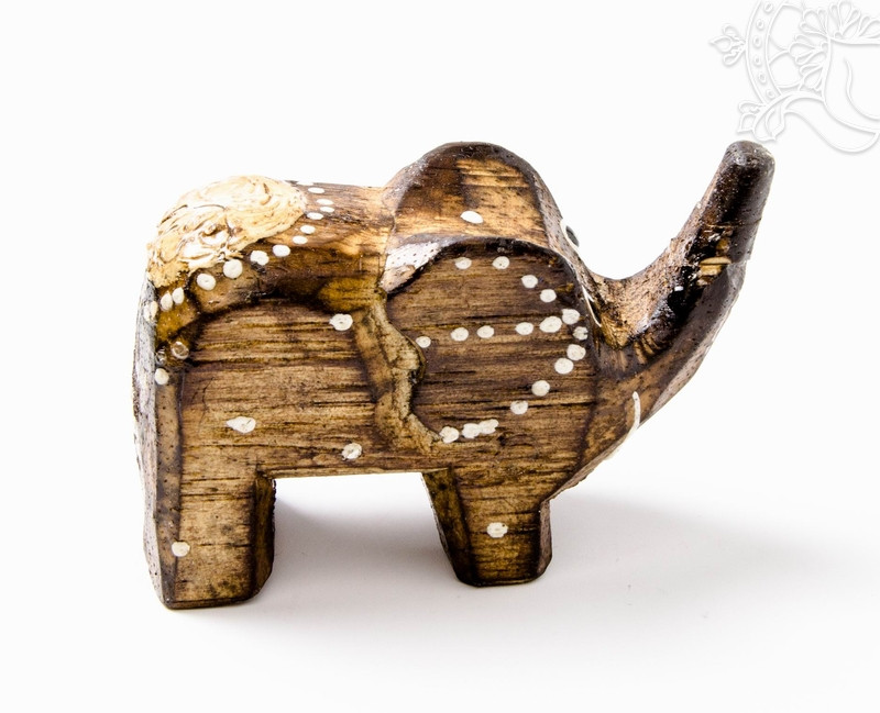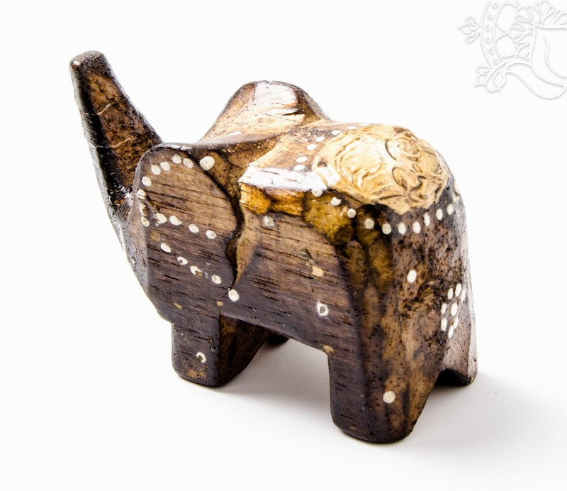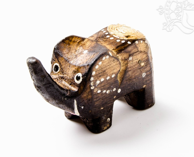 Fából faragott festett elefánt szobor. A szobor magassága 4,5 cm, hosszúsága 7,5 cm. Az elefánt a siker, az erő, a bölcsesség, a függetlenség, a hatalom, a termékenység, a jámborság, a higgadtság és a hosszú élet szimbóluma.