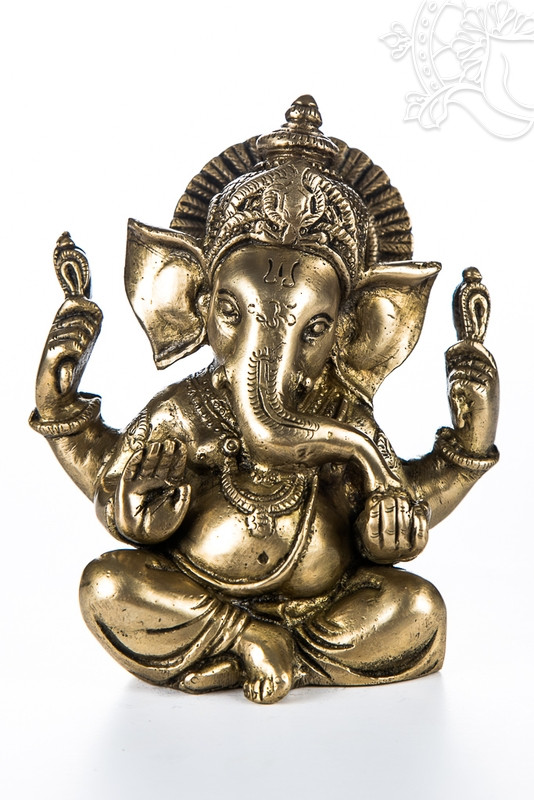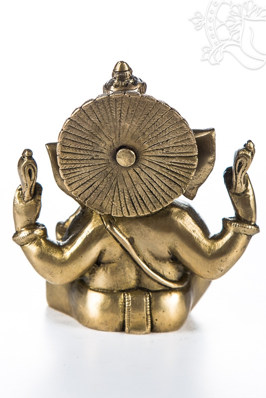 Rézből készült Ganesha szobor, matt sárga színű. Magassága 14 cm, a súlya 1,50 kg.Ganésha lásd: