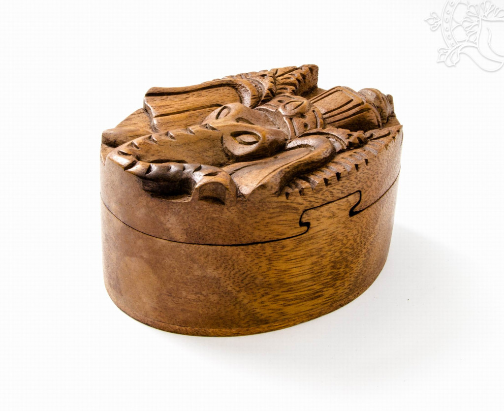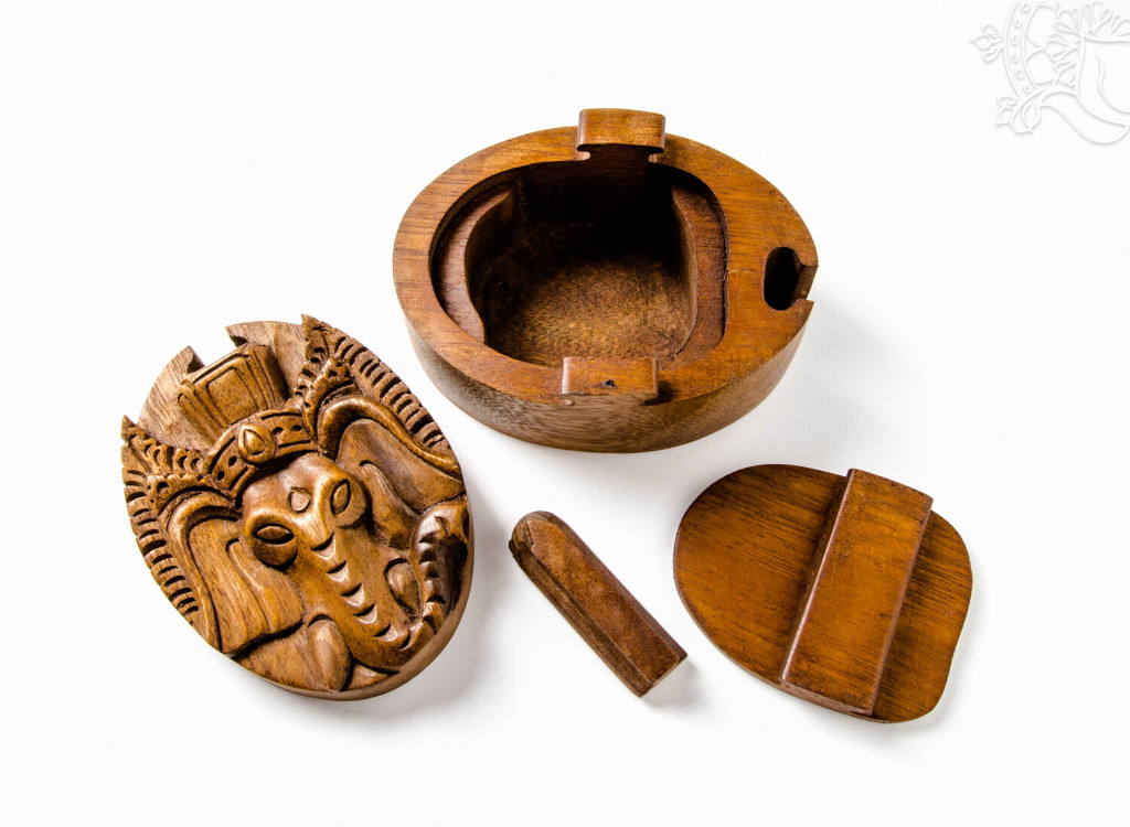 Fából készült, Ganesha, ovális titokdoboz. Alapja 11 cm x 8 cm, magassága 6,5 cm.Ganésha lásd: