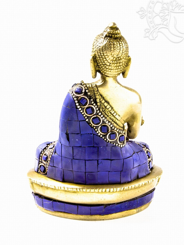 Aprólékosan kidolgozott, rézből készült Gyógyító Buddha szobor, kővel berakott. A szobrok kövezése egyedileg történik, az eges szobrok között a kövezésben kisebb különbségek lehetségesek. Magassága 14 cm, súlya 780 g.Gyógyító Buddha lásd: