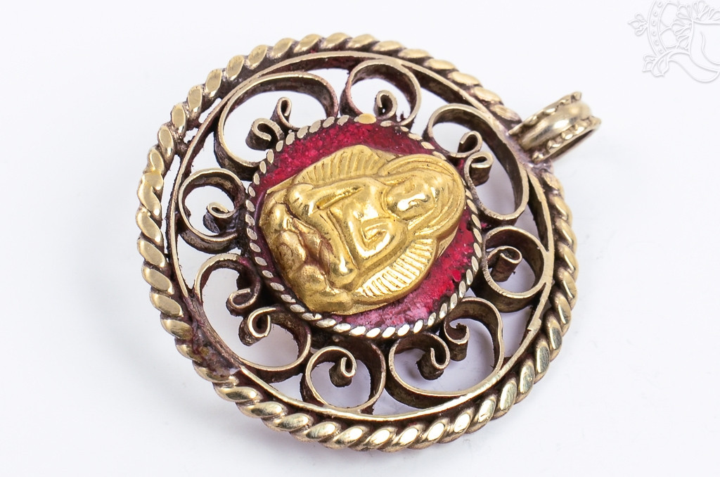 Fémből készült kétoldalú filigrán medál, középen korall berakással és Buddhával. A medál magassága 3,5 cm. A termék áldott.