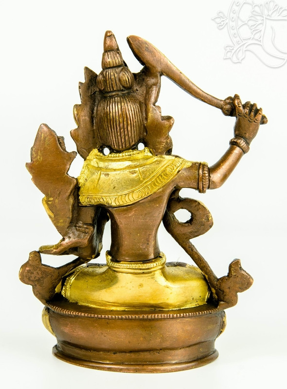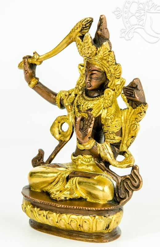Rézből készült Manjushri szobor, arany-bronz színű. Magassága 14 cm, súlya 620 g. Manjushri: