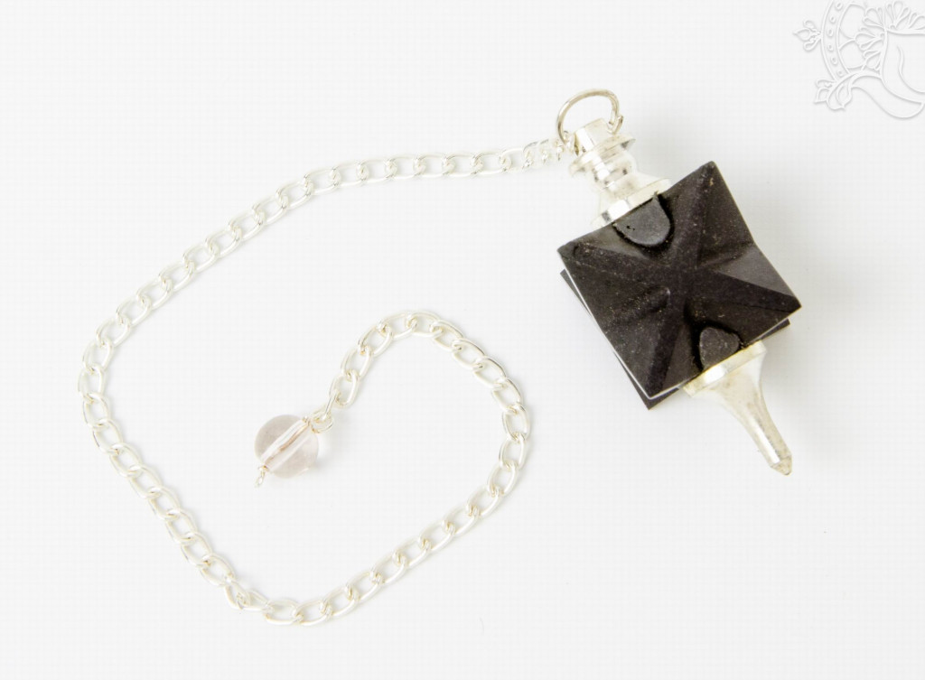 Fekete turmalinból készült, merkaba alakú inga. Hosszúsága 3,5 cm.