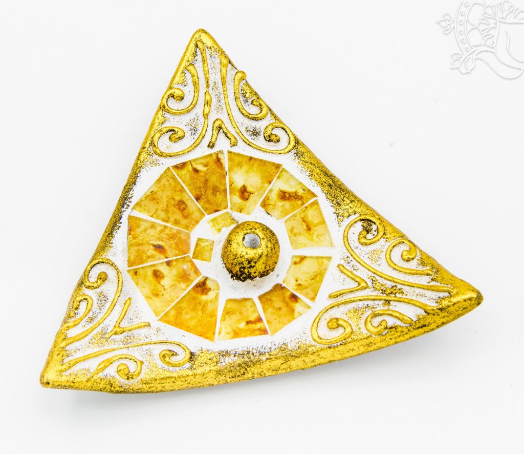Mozaikos kerámia háromszög alakú füstölő égető, arany színű festéssel. Oldalai 11 cm-esek. Mindegyik darab egyedi mintázatú.