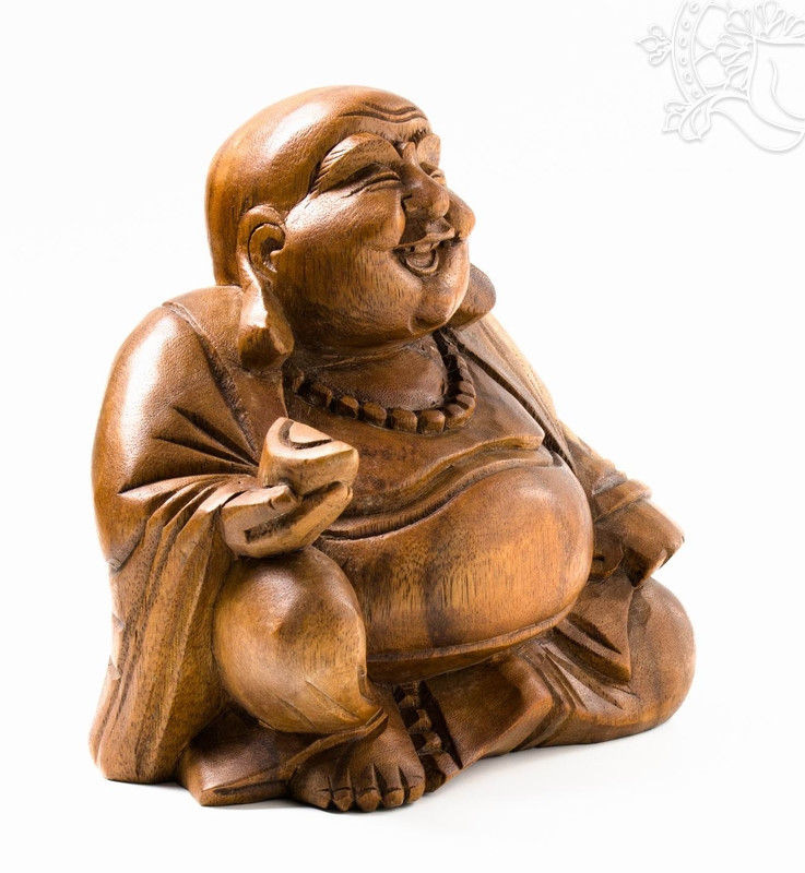 Fából faragott nevető Buddha szobor. A szobor magassága 20 cm. Nevető Buddha a bőség és a szerencse szimbóluma. A szobrok egyedileg készülnek, kisebb különbségek lehetnek az egyes szobrok között.Nevető Buddha jelentése: