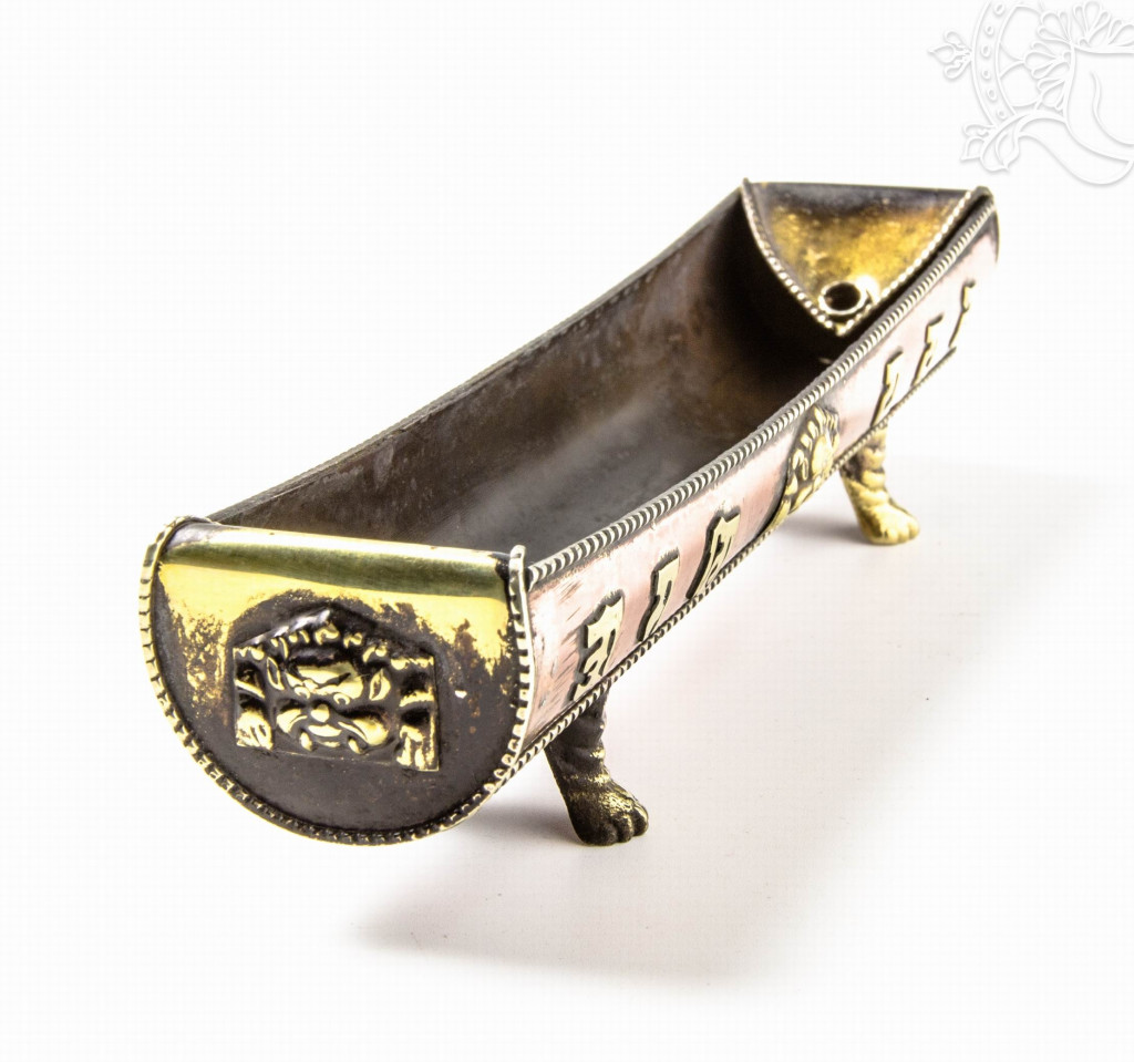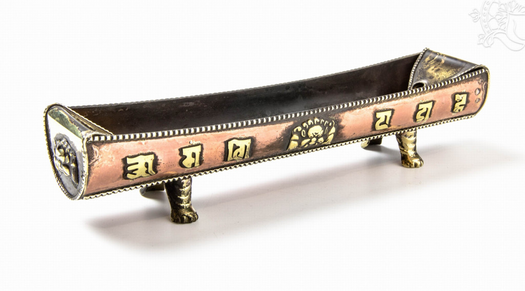 Nyitott füstölő égető Om Mani Padme Hum mantrával, réz színben. Hosszúsága 18 cm, magassága 4 cm. A termék áldott.