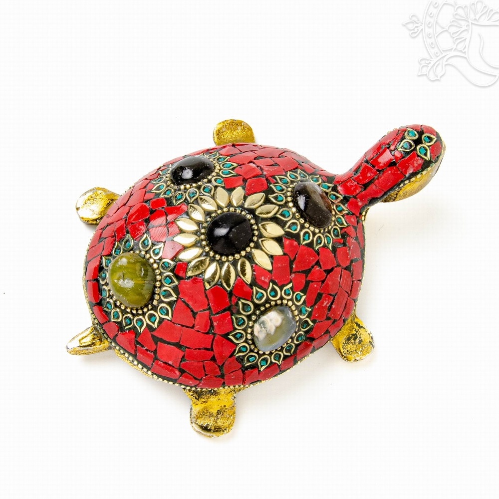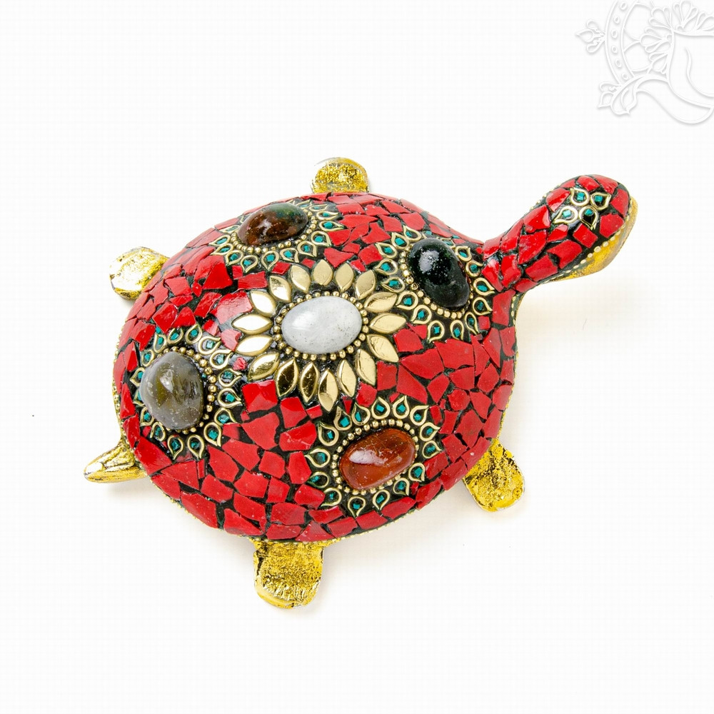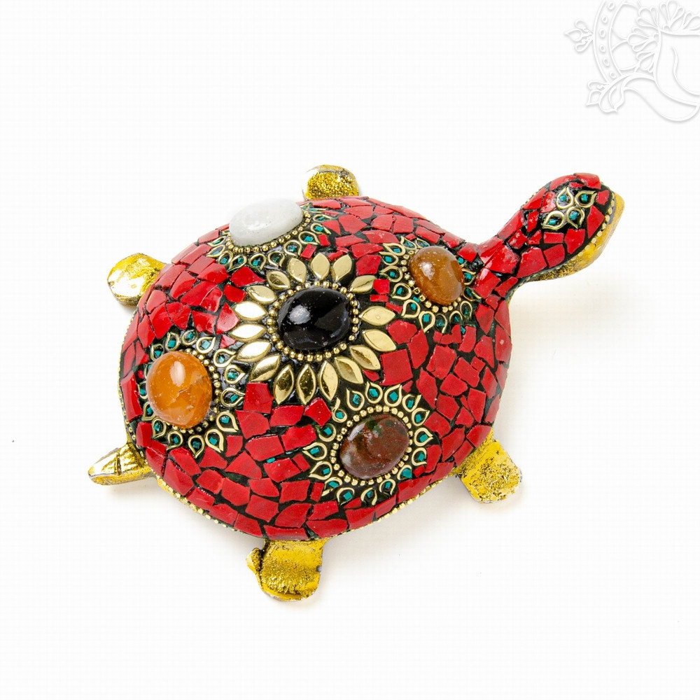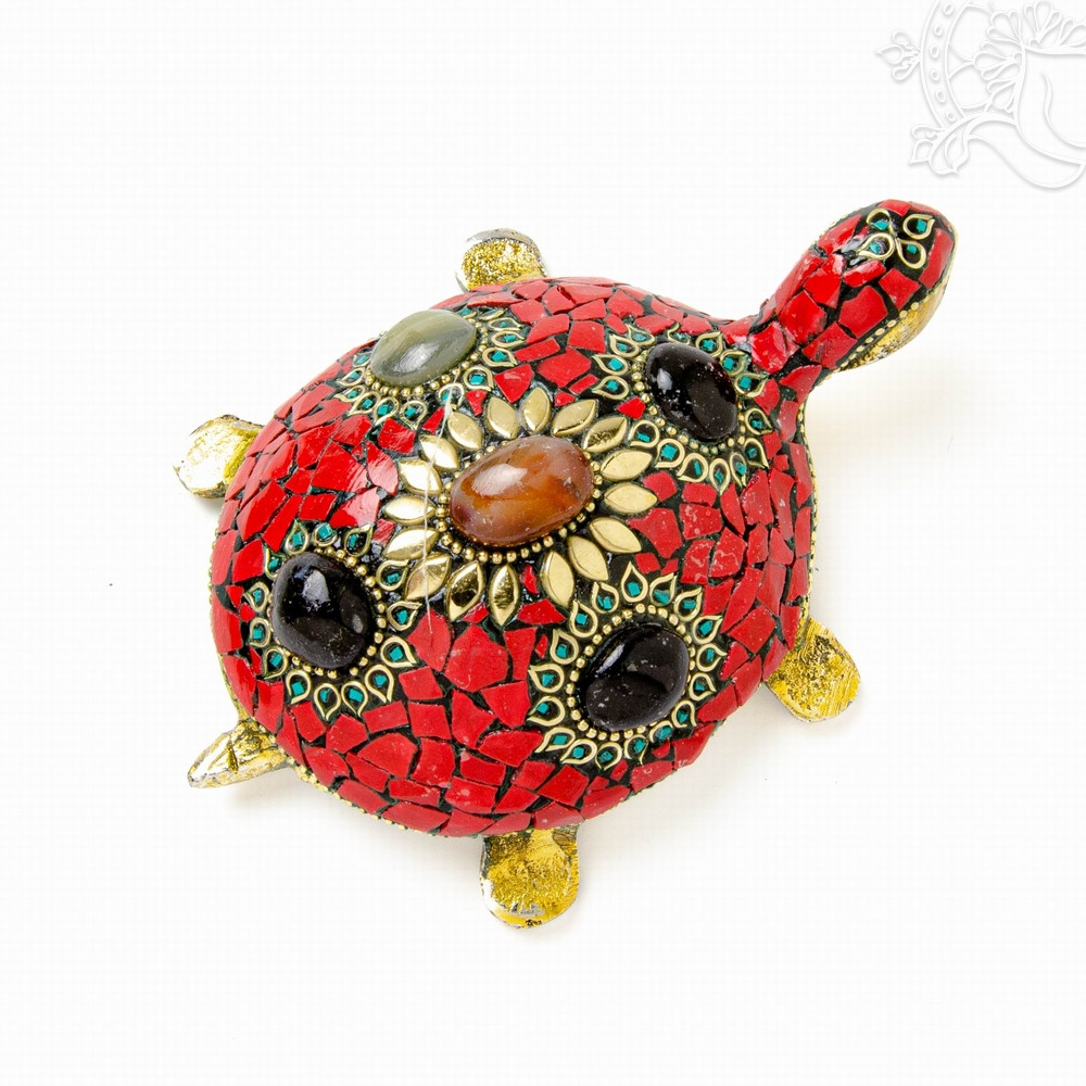 9 cm-es fémből készült réz színű teknős szobor, piros mozaikos kő berakással, 5 féldrágakővel díszítve. A teknős a buddhista és hindu hagyományban a stabilitás, hosszú élet és védelmező energiák szimbóluma.