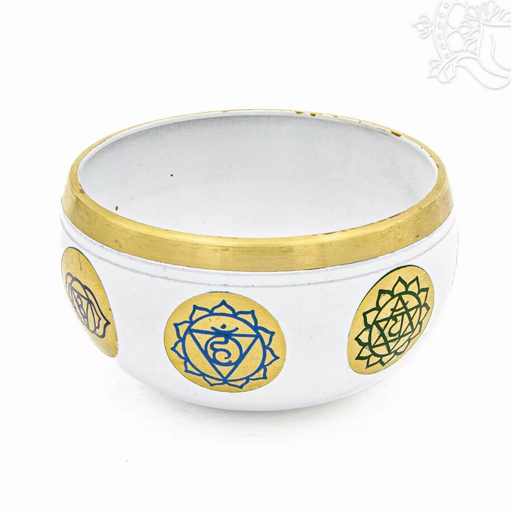 Géppel készített 7 fémes, fehér színű, 7 csakra mintás hangtál - 10 cm