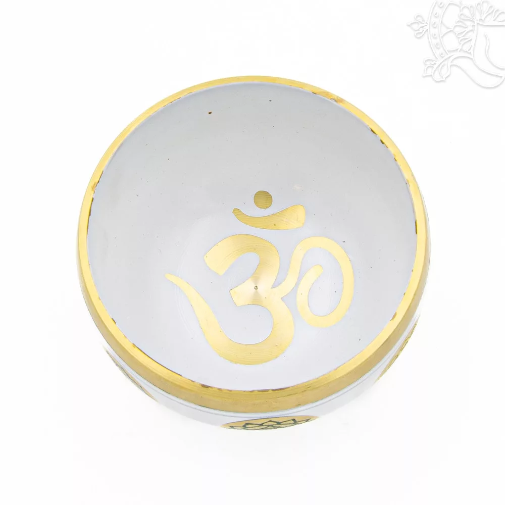 10 cm átmérőjű, 6,5 cm magas, 478 gramm súlyú géppel készített 7 fémes, fehér színű hangtál, oldalán arany színű 7 csakra szimbólummal, belül OM jellel díszített.