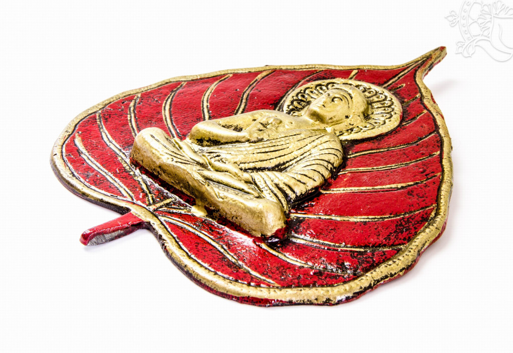 Fémből készült, falra akasztható dísz, Tanító Buddhával Bódhi levélen. Magassága 20 cm.